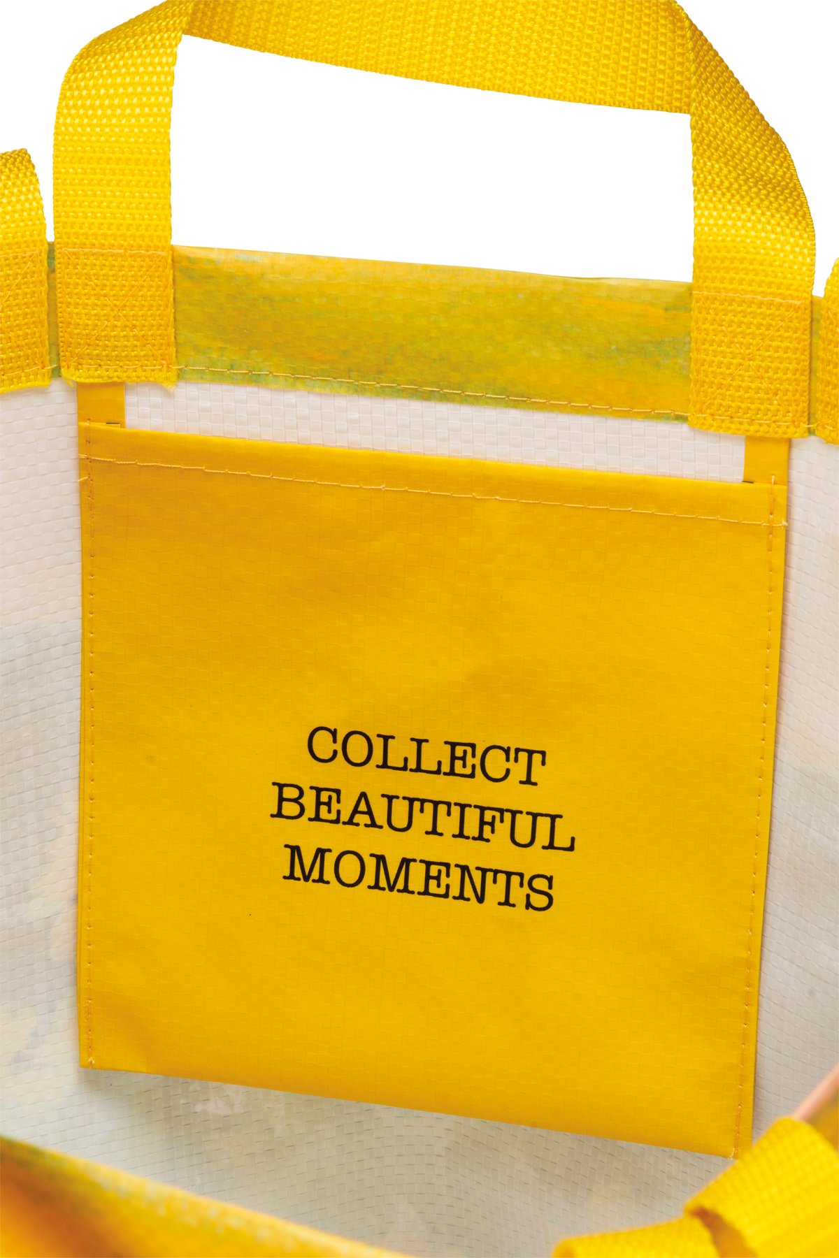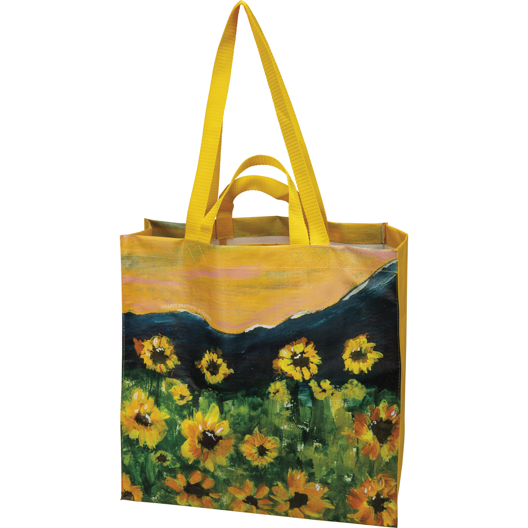 Made of post-consumer material, this double-sided market tote lends an abstract sunflower field design, replicated from original art created at the Friendship Heart Gallery in downtown Lancaster, PA by artists with intellectual disabilities and autism. Gusset features coordinating color. Bag includes complementing nylon hand and shoulder straps and inside pocket with "Collect Beautiful Moments" sentiment.