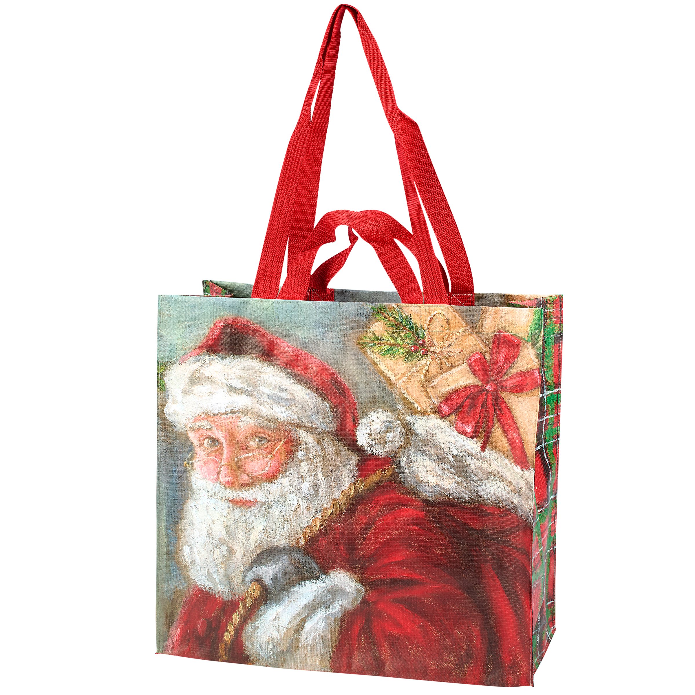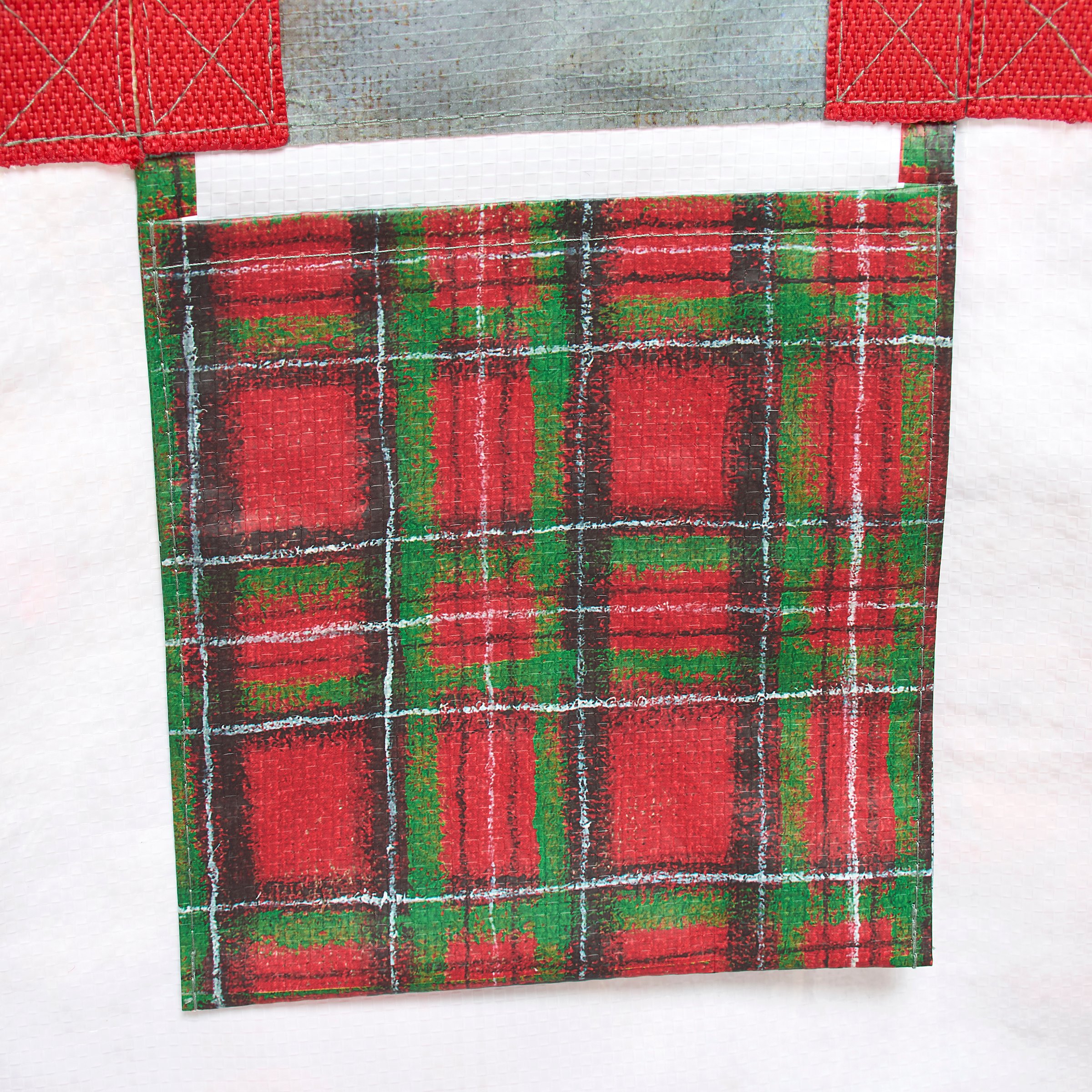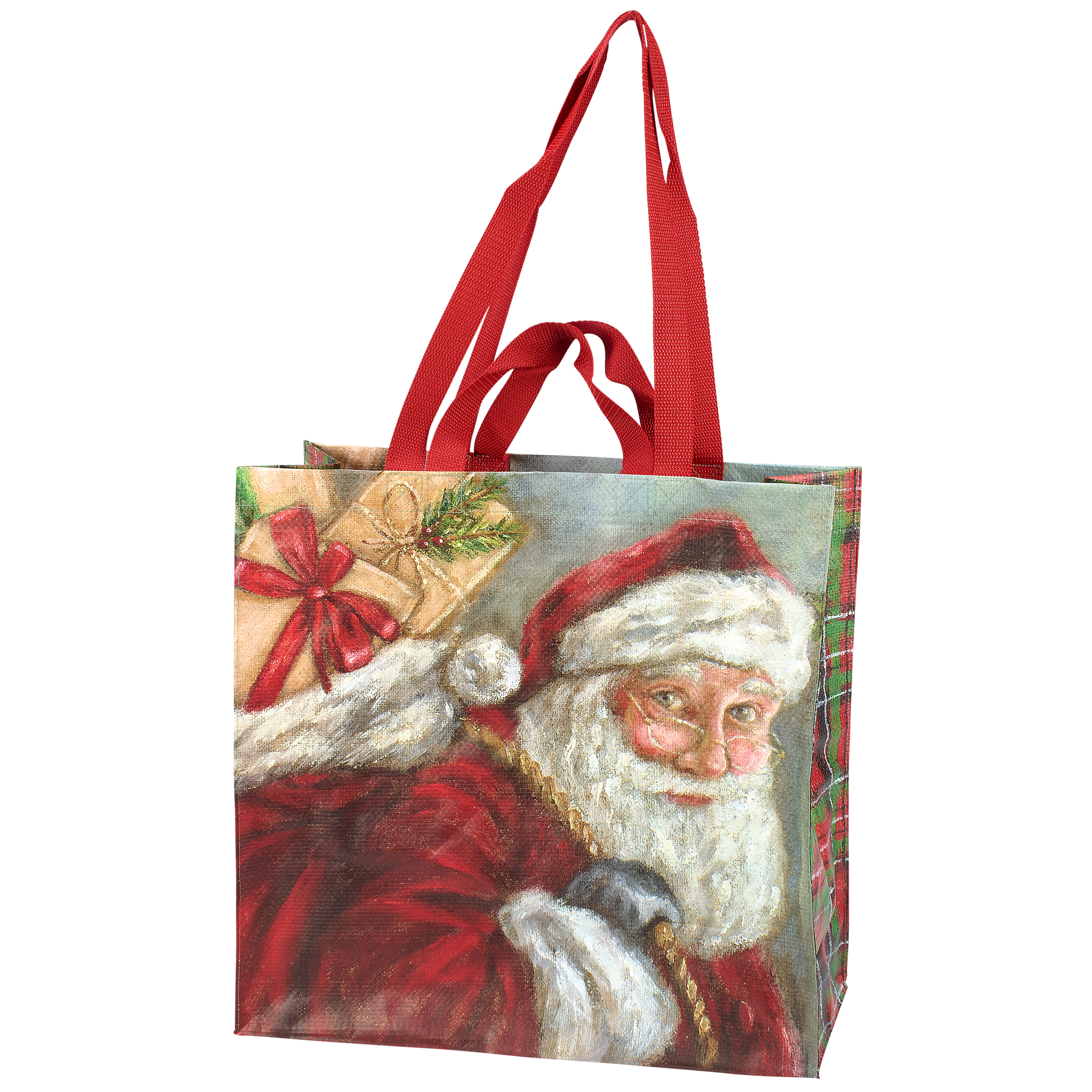A double-sided market tote from our Christmas Collection displaying a charming scene of Santa delivering presents on Christmas eve. Santa design is replicated from original artwork painted onto burlap canvas, giving the art a unique depth and texture. Christmas tote gussets display coordinating holiday inspired tartan plaid. Seasonal market tote includes both hand and shoulder straps in red nylon and a convenient inside pocket with tartan plaid. Our Christmas Eve Santa market tote is made from eco-friendly post-consumer material and folds flat for compact storage. A rustic Christmas tote perfect for a seasonal accessory and great for reusable gift wrapping.