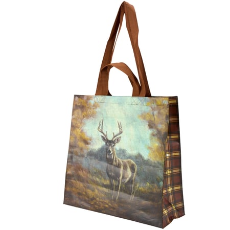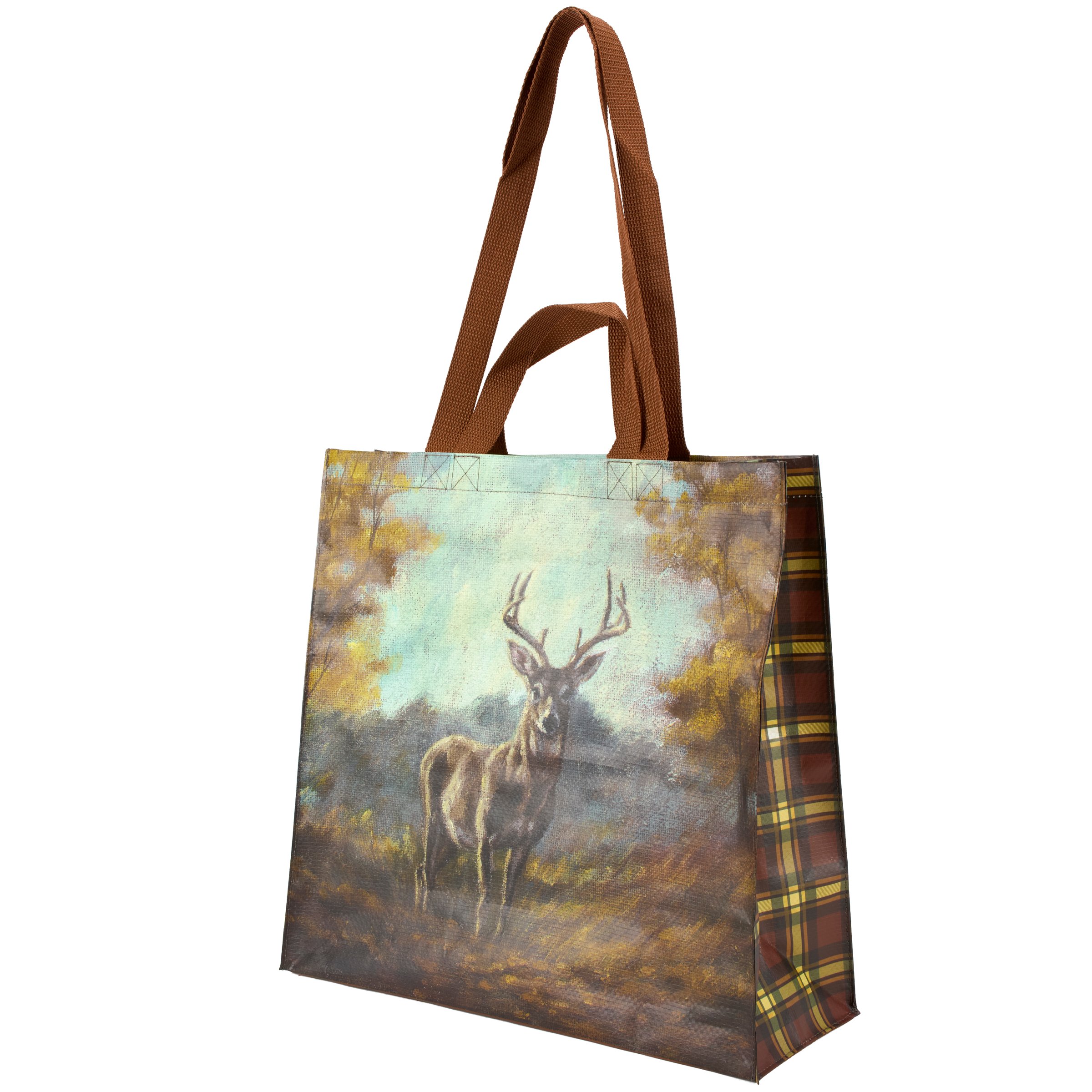 A market tote from our Fall & Harvest Collection featuring a double-sided design displaying an autumn scene of deer in the forest. Fall deer design is replicated from original artwork painted onto burlap canvas, giving the art a unique depth and texture. Tote gussets display coordinating fall inspired tartan plaid. Seasonal market tote includes both hand and shoulder straps in brown nylon and a convenient inside pocket displaying a squirrel. Our Fall Deer market tote is made from eco-friendly post-consumer material and folds flat for compact storage. A rustic fall tote perfect for a seasonal accessory and great for reusable gift wrapping.