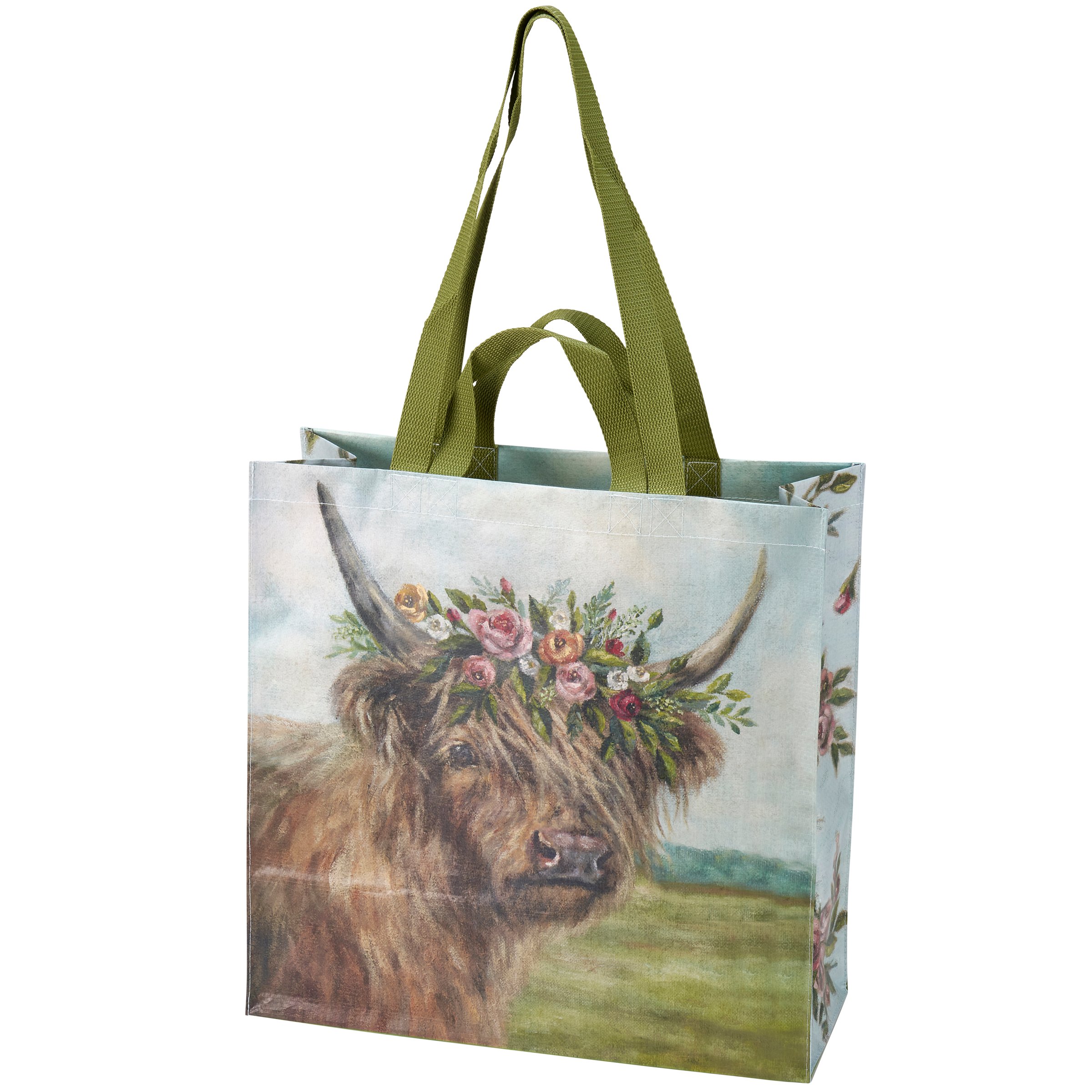 A double-sided market tote from our Easter & Spring Collection displaying an enchanting scene of a highland cow wearing a crown of vibrant spring florals. Side gussets display coordinating design of spring flowers. Designs are replicated from original artwork painted onto burlap canvas, giving the art a unique depth and texture. Market tote includes both hand and shoulder straps in green nylon and a convenient inside pocket with spring flower design. Our Floral Highland Cow tote bag is made from eco-friendly post-consumer material and folds flat for easy storage. A charming seasonal accessory perfect for shopping or traveling.