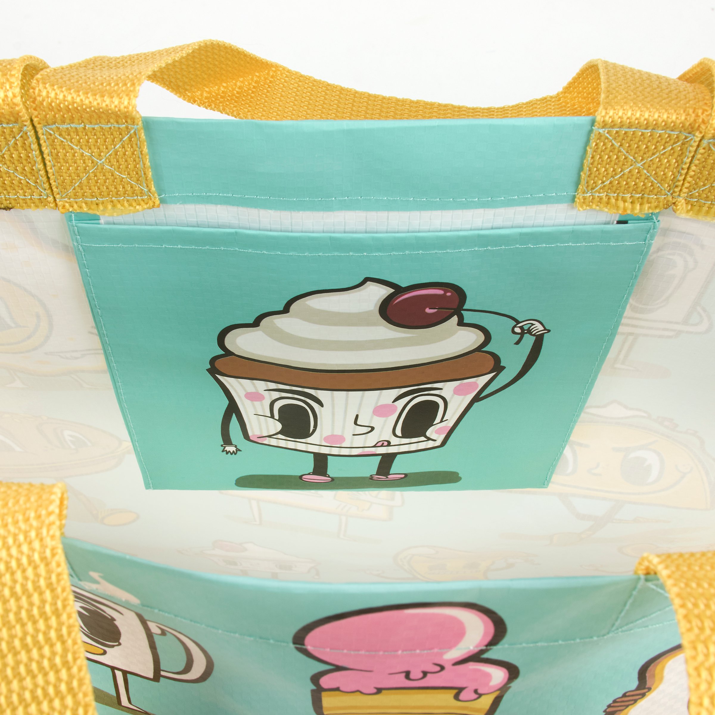 A double-sided market tote from our LOL-Made You Smile Collection displaying playful hand illustrated designs of various food characters hanging out together in a fun retro style. Foodie tote gussets display a coordinating retro checkerboard pattern. This everyday market tote includes both hand and shoulder straps in yellow nylon and a convenient inside pocket displaying a cupcake character. Our Food Crew tote bag is made from eco-friendly post-consumer material and folds flat for easy storage. A fun food-themed tote perfect for an everyday accessory or traveling.