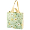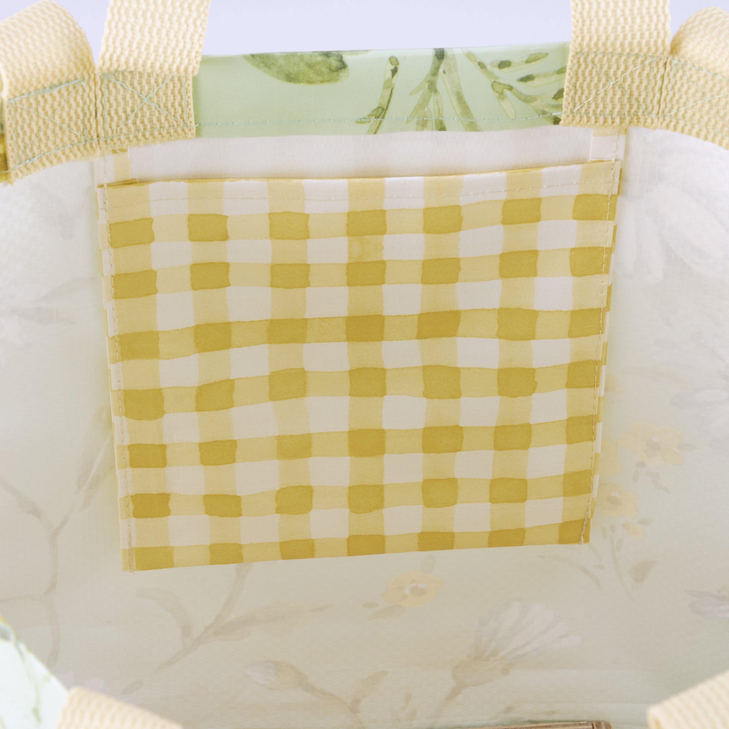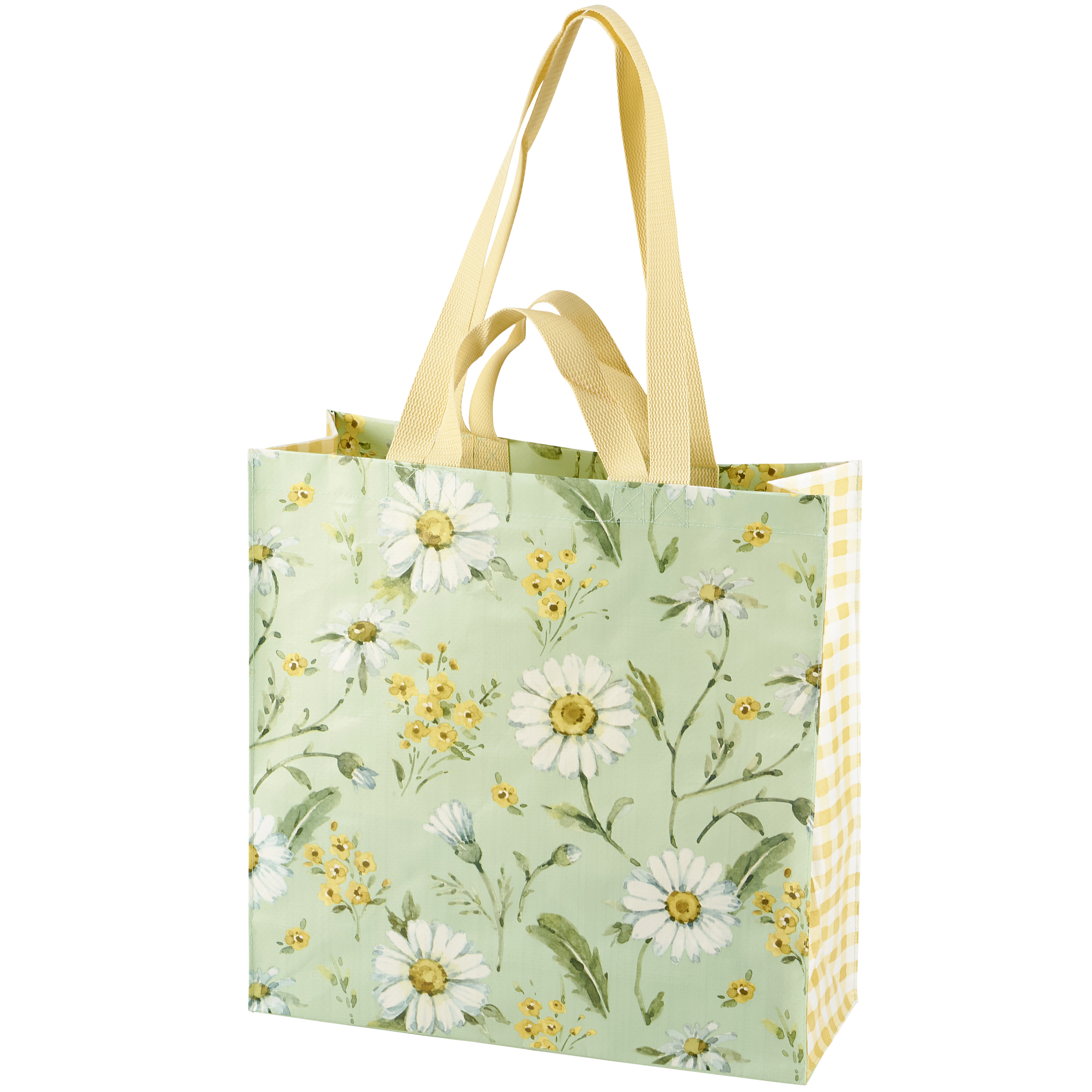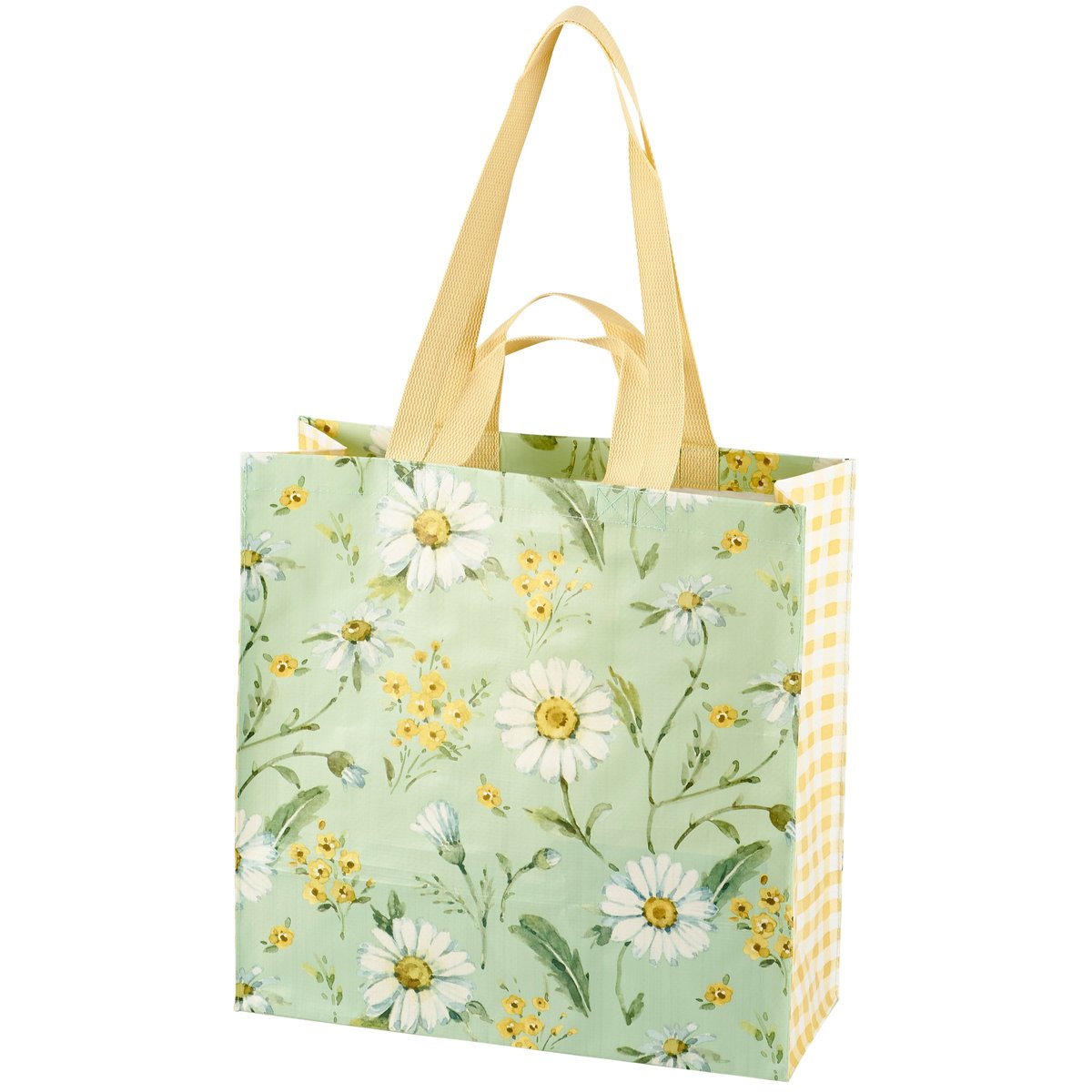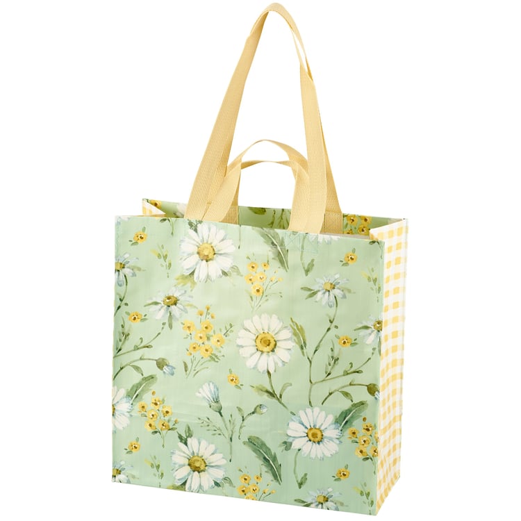 A double-sided market tote from our Garden Collection displaying an all-over design of daisies on a green background. Side gussets display coordinating yellow gingham pattern. Designs are replicated from original art hand painted in a delicate watercolor style. Market tote includes both hand and shoulder straps in yellow nylon and a convenient inside pocket with yellow gingham design. Our Green Daisy market tote is made from eco-friendly post-consumer material and folds flat for easy storage. A charming everyday accessory perfect for shopping or traveling.