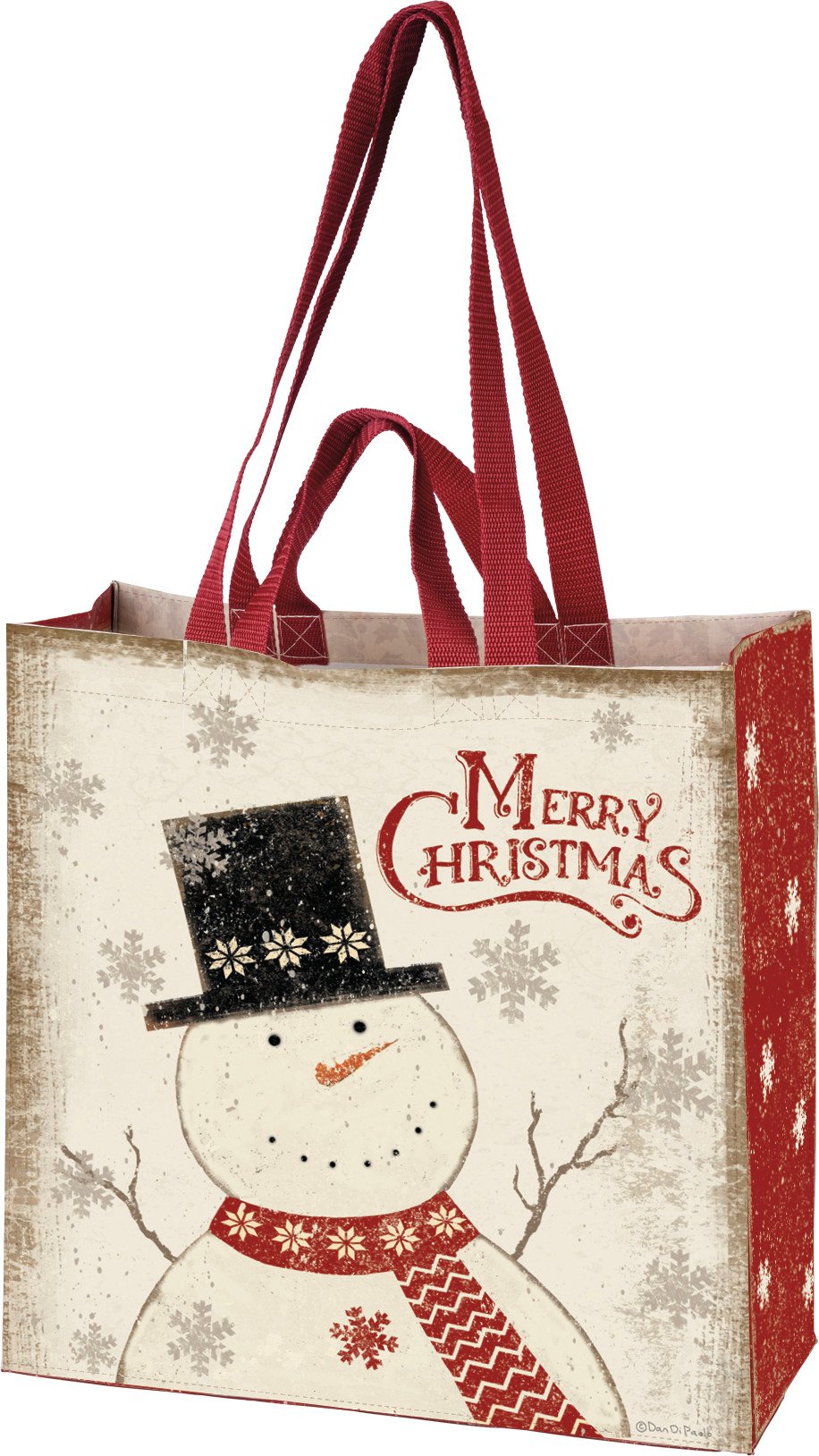A double-sided market tote featuring a rustic snowman design with "Merry Christmas" sentiment and patterned gusset. Inside features pocket. Tote is made of post-consumer material with dual nylon handles.