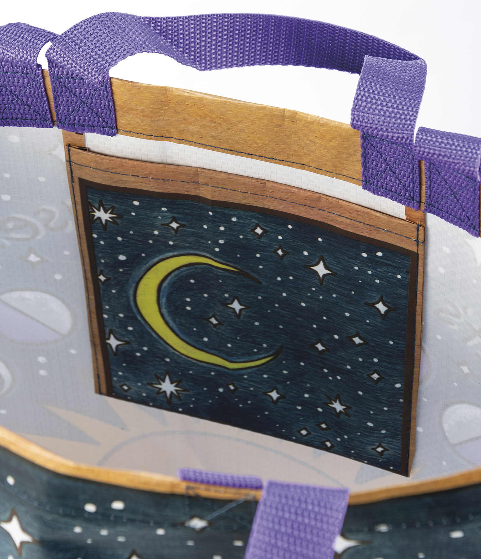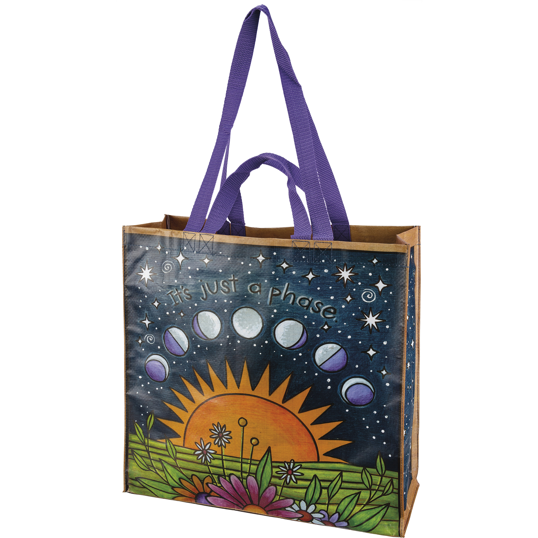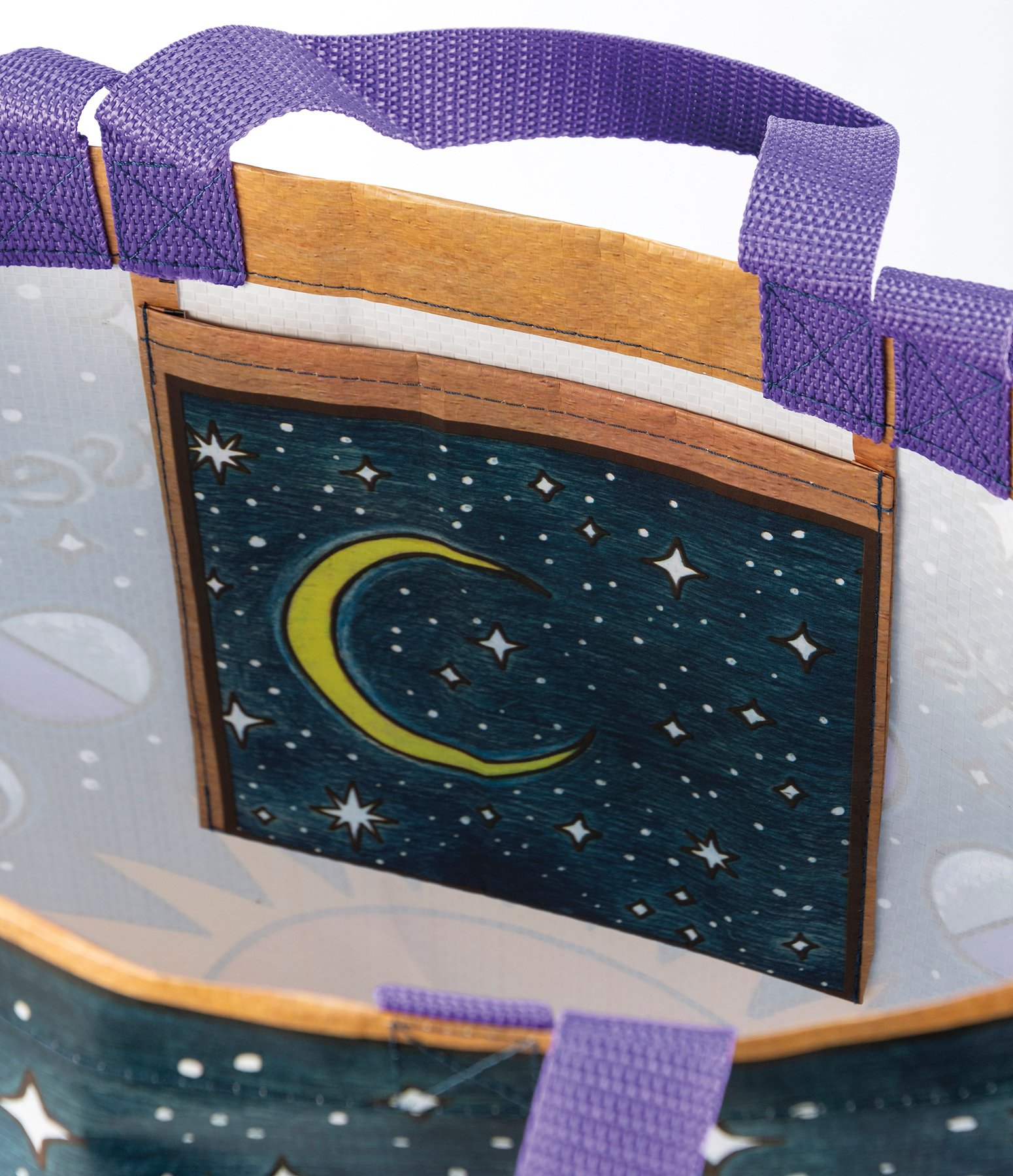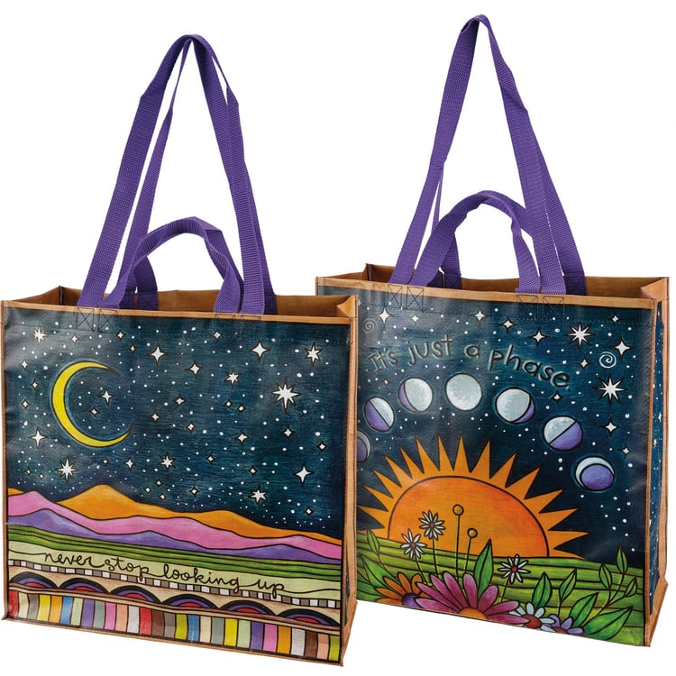 Made of post-consumer material, this double-sided market tote features woodburned celestial designs in a vibrant palette with "Never Stop Looking Up" and "It's Just A Phase" sentiments. Gusset features coordinating pattern. Bag includes complementing nylon hand and shoulder straps and inside pocket.