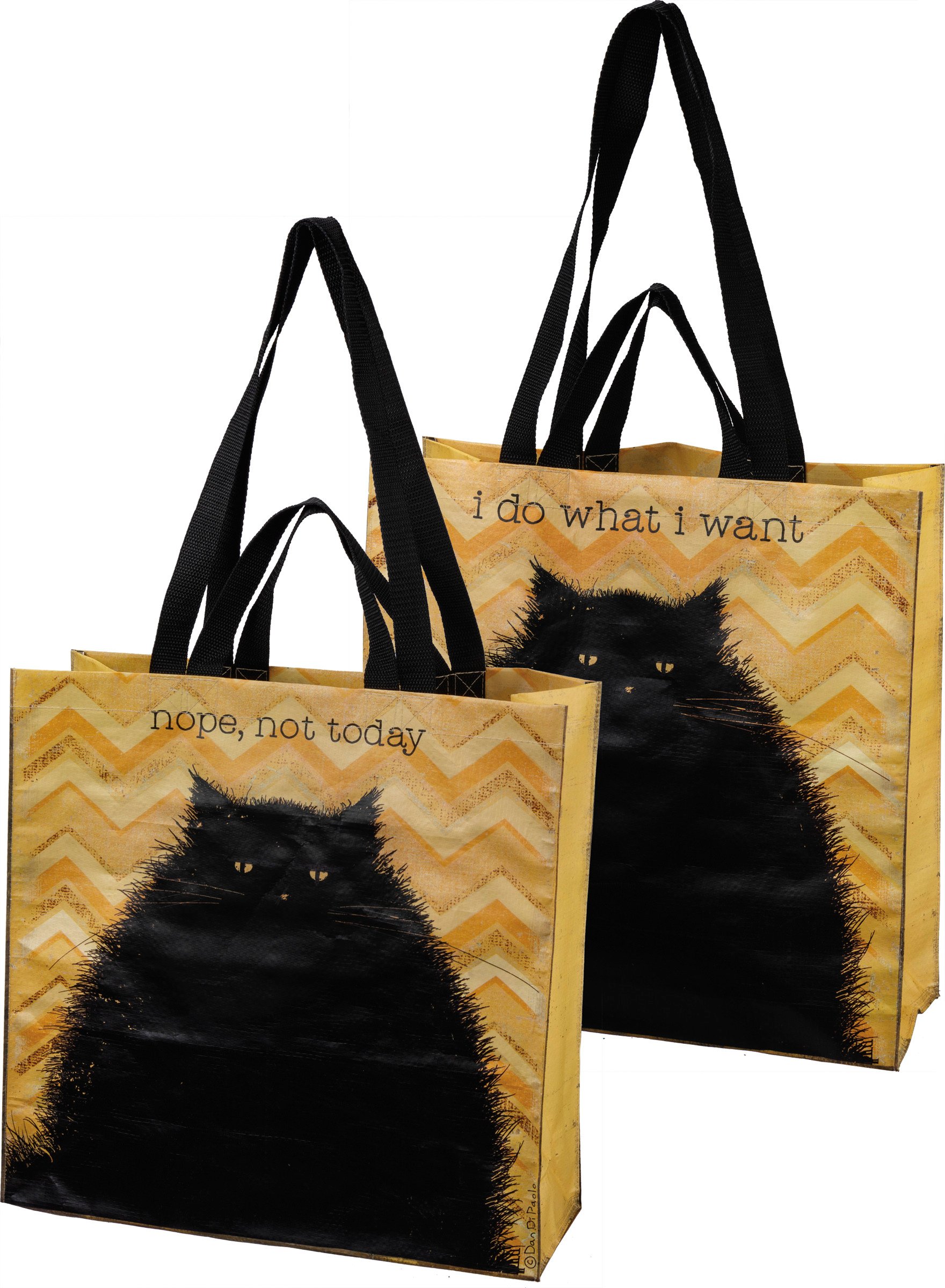A rustic-inspired market tote bag featuring double-sided "Nope, Not Today / I Do What I Want" sentiments with smug fluffy cat designs. Contains dual shoulder and hand straps with interior pocket; made from post-consumer materials. Complements well with coordinating pieces in collection for a sassy pet display.