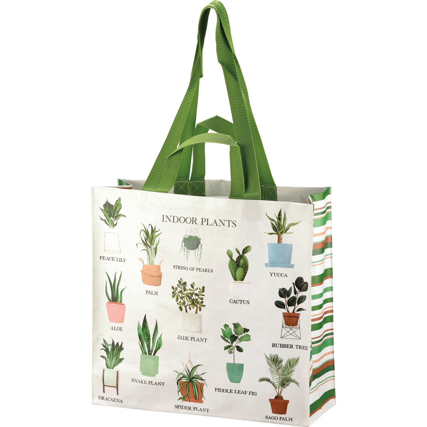A double-sided market tote from our Plant Parent Collection is perfect for all your shopping needs! Features "Indoor Plants" sentiment with potted plant designs accompanied by their names. Gussets feature complementing stripe pattern. Inside features pocket. Our Plant tote bag is made of post-consumer material and includes coordinating dual nylon hand and shoulder straps.