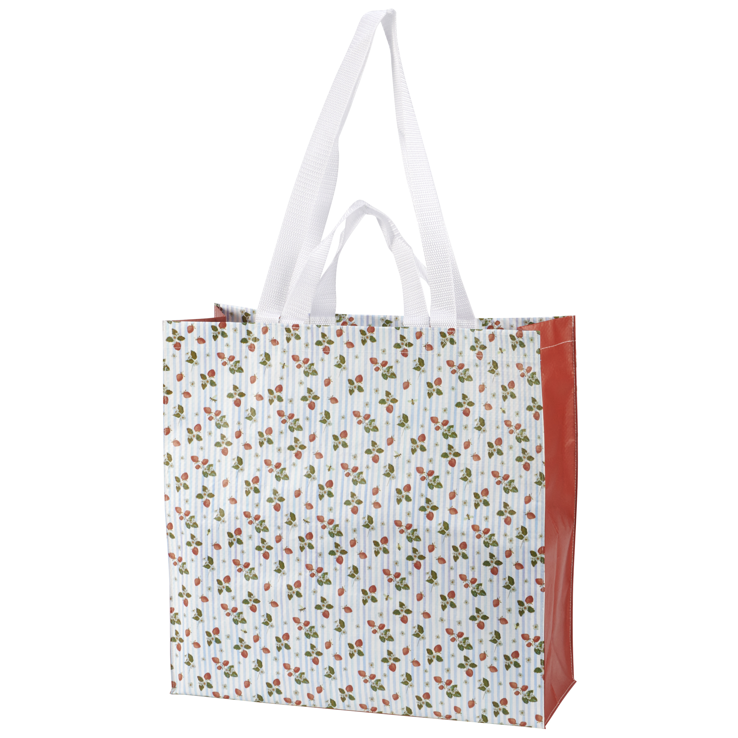 A double-sided market tote from our Garden Collection displaying an all-over design of wild strawberries on a light blue stripe background. Side gussets display coordinating red color. Designs are replicated from original art hand painted in a unique watercolor style. Market tote includes both hand and shoulder straps in white nylon and a convenient inside pocket with light blue stripes. Our Strawberry market tote bag is made from eco-friendly post-consumer material and folds flat for easy storage. A charming strawberry-themed accessory perfect for shopping or traveling.