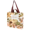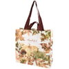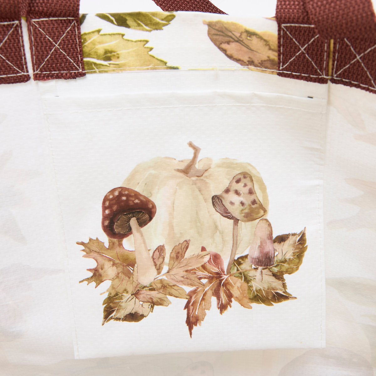 A double-sided market tote from our Fall & Harvest Collection displaying autumn leaves with pumpkins and mushrooms around an inspirational seasonal sentiment that reads "Thankful." Fall design is replicated from original art hand painted in a unique watercolor style. Seasonal market tote includes both hand and shoulder straps in brown nylon and a convenient inside pocket displaying white pumpkin and fall foliage. Our Thankful market tote bag is made from eco-friendly post-consumer material and folds flat for easy storage. A rustic fall-themed accessory perfect for shopping or traveling.