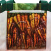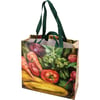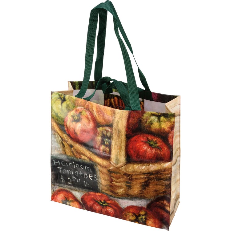 Made of post-consumer material, this double-sided market tote from our Garden Collection featuring an "Heirloom Tomatoes $2.50 lb." sentiment with vegetable designs. Designs are replicated from original artwork painted onto burlap canvas, giving the art a unique depth and texture. Gusset features coordinating design. Our Vegetable tote bag includes complementing nylon hand and shoulder straps and inside pocket with carrot design.