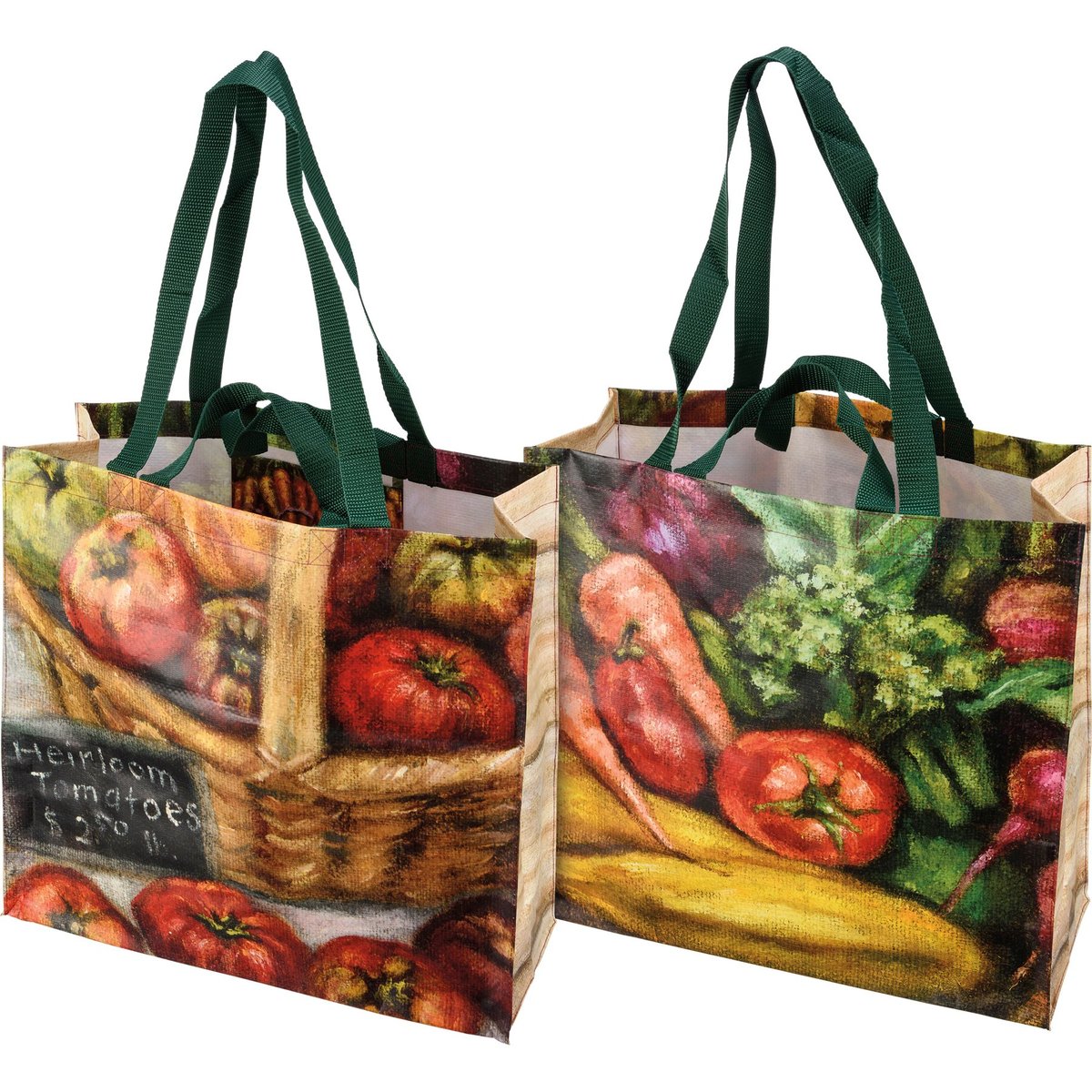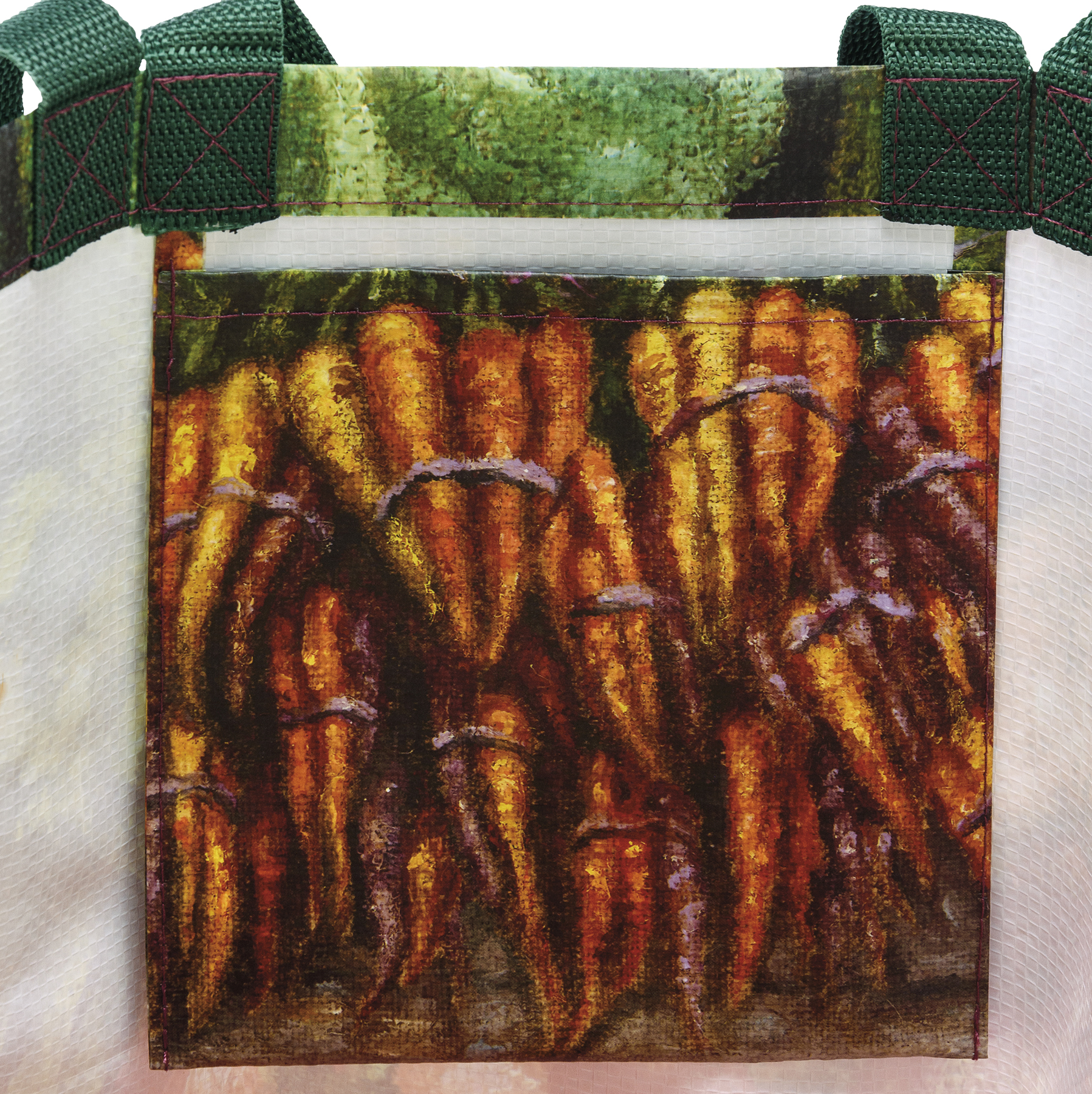 Made of post-consumer material, this double-sided market tote from our Garden Collection featuring an "Heirloom Tomatoes $2.50 lb." sentiment with vegetable designs. Designs are replicated from original artwork painted onto burlap canvas, giving the art a unique depth and texture. Gusset features coordinating design. Our Vegetable tote bag includes complementing nylon hand and shoulder straps and inside pocket with carrot design.