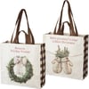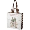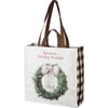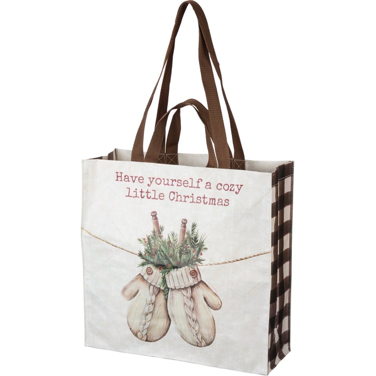 A double-sided market tote bag from our Christmas Collection featuring a "Warmest Holiday Wishes" sentiment with scarf bow and wreath designs, reverse "Have Yourself A Cozy Little Christmas" sentiment with mittens and bristled branch designs, and gingham print panels. Complements well with coordinating styles for a cozy and cohesive collection. Our Warmest Holiday Wishes market tote bag contains interior pocket and dual shoulder and drop handles; made from post-consumer materials.