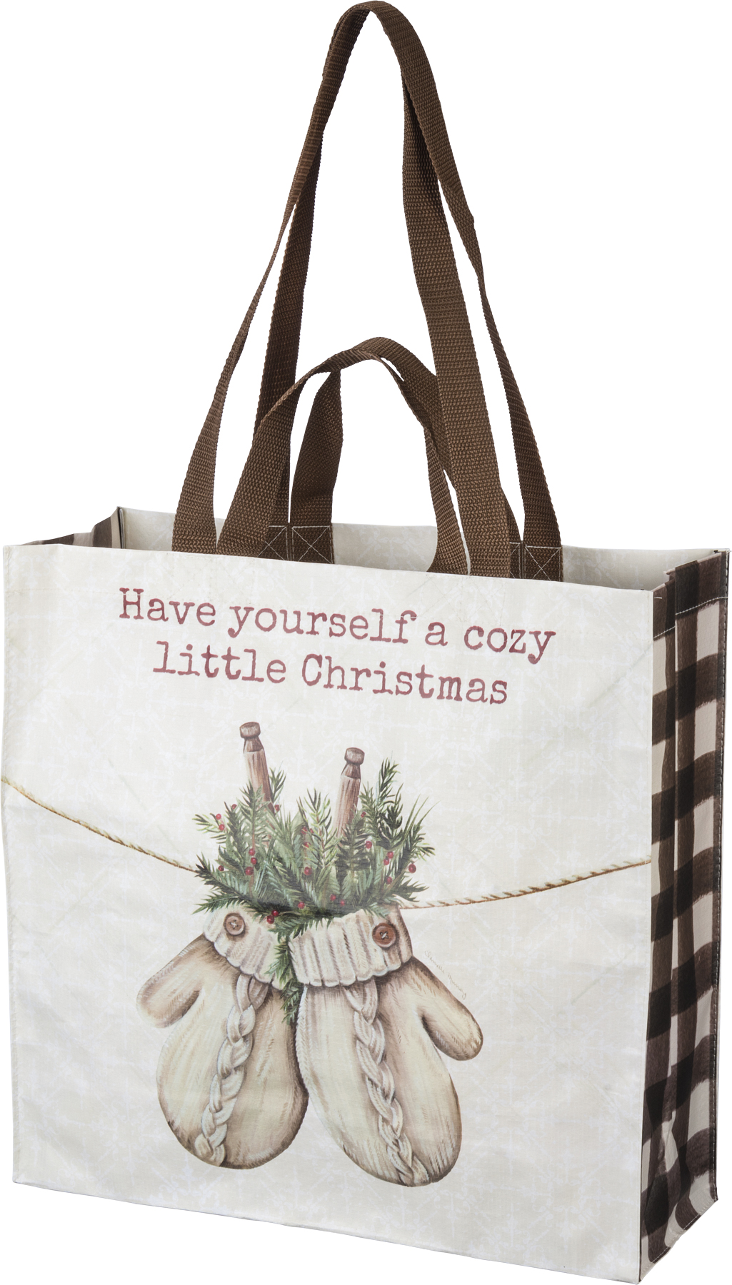 A double-sided market tote bag from our Christmas Collection featuring a "Warmest Holiday Wishes" sentiment with scarf bow and wreath designs, reverse "Have Yourself A Cozy Little Christmas" sentiment with mittens and bristled branch designs, and gingham print panels. Complements well with coordinating styles for a cozy and cohesive collection. Our Warmest Holiday Wishes market tote bag contains interior pocket and dual shoulder and drop handles; made from post-consumer materials.