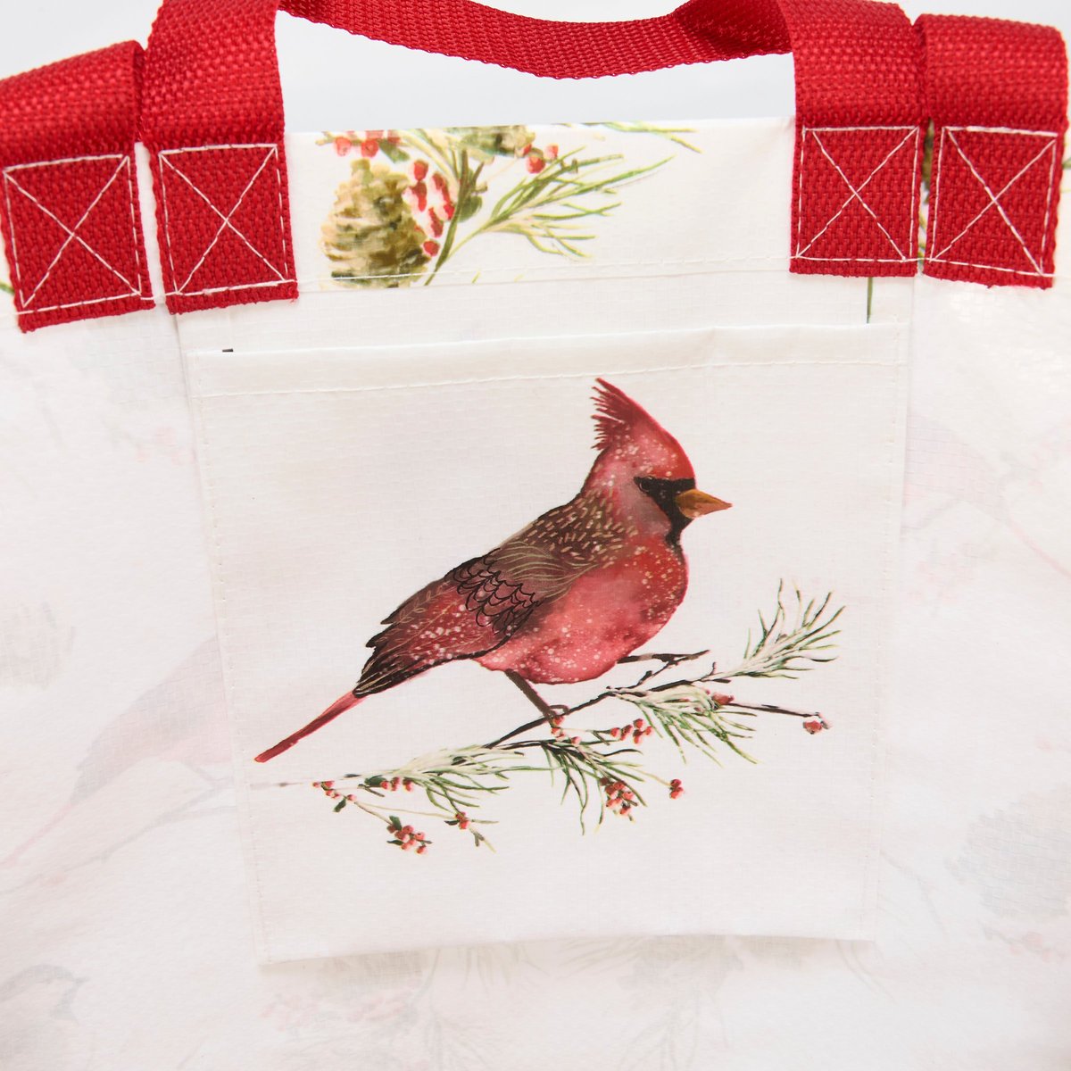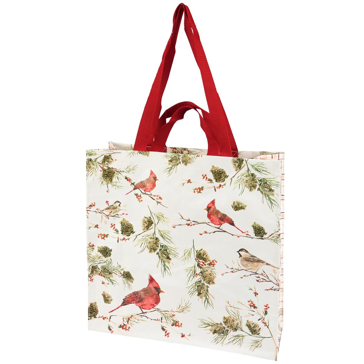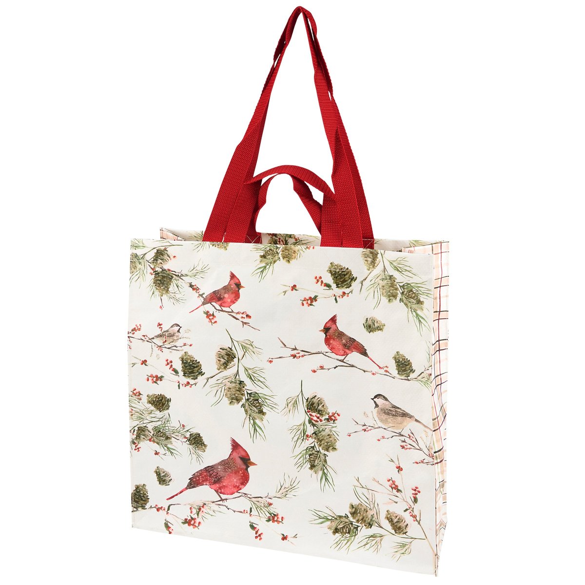 A double-sided market tote from our Christmas Collection displaying a pattern of winter birds perched on a snowy branch including red cardinals and chickadees. Winter bird designs are replicated from original art hand painted in a unique watercolor style. Christmas tote gussets display coordinating plaid pattern. Seasonal market tote includes both hand and shoulder straps in red nylon and a convenient inside pocket displaying a red cardinal design. Our Winter Birds market tote bag is made from eco-friendly post-consumer material and folds flat for easy storage. A rustic Christmas tote perfect for a seasonal accessory and great for reusable gift wrapping.