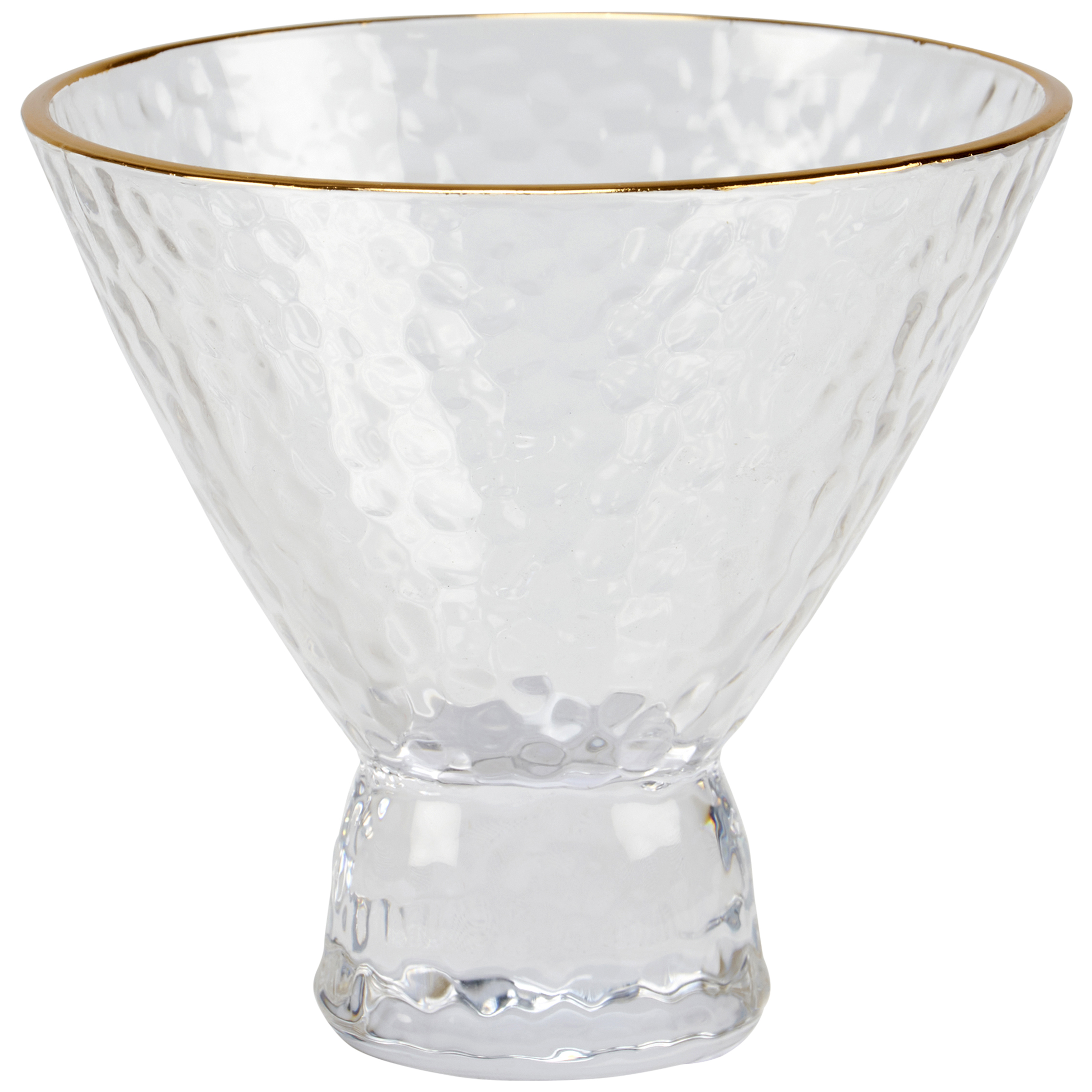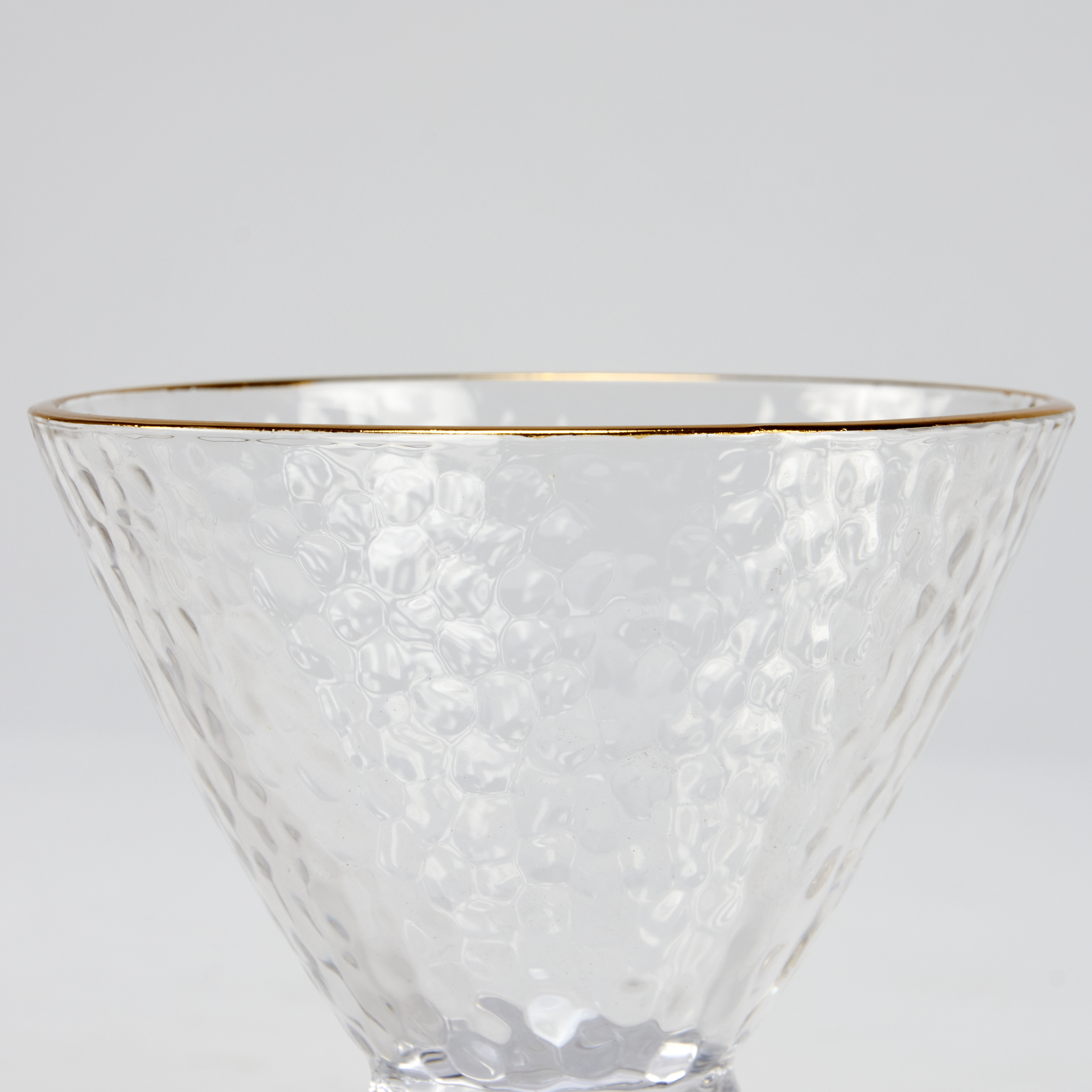 An 8 oz martini glass displaying an art deco inspired design with textured glass and metallic gold accent on the rim. Our small Gold Rim martini glass coordinates well with table décor from our Art Deco Collection. Hand wash only. A piece of vintage drinkware perfect for everyday gatherings.