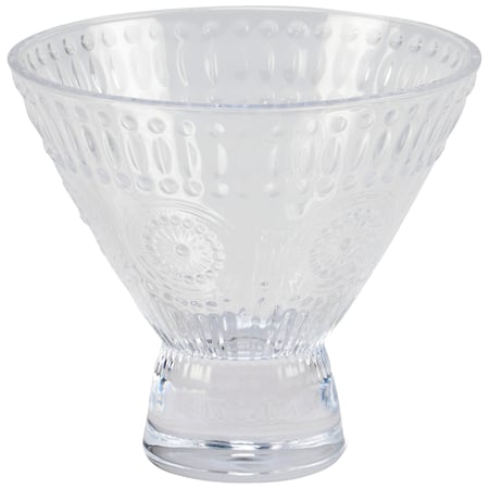 An 8 oz martini glass displaying a textured vintage medallion design on the glass. Our small Medallion martini glass coordinates well with table décor from our Cottagecore Collection. Hand wash only. A piece of vintage drinkware perfect for everyday gatherings.