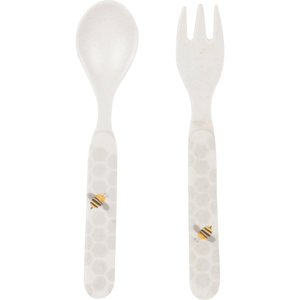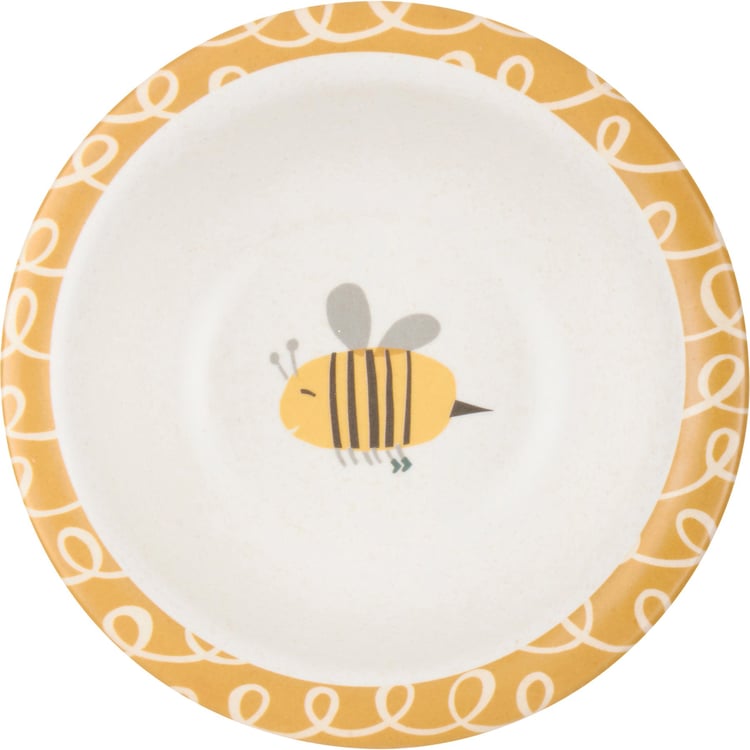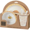 A cohesive meal set featuring a dishwasher safe bowl, plate, cup, fork, and spoon with block print bee designs. Meal set is BPA-free, thoughtfully made with bamboo fibers, and packaged in a high-quality kraft paper box making it ready for easy gifting. Another adorable addition to our exclusive Happy + Bright Collection. Our Bee Skep meal set is not microwave safe.