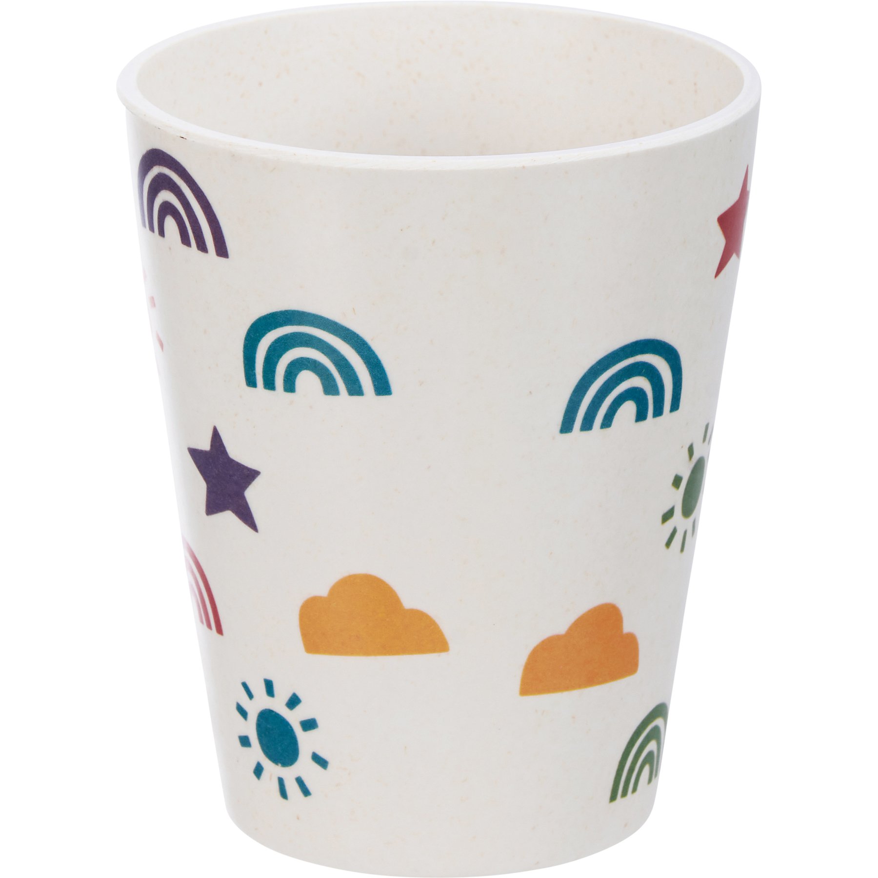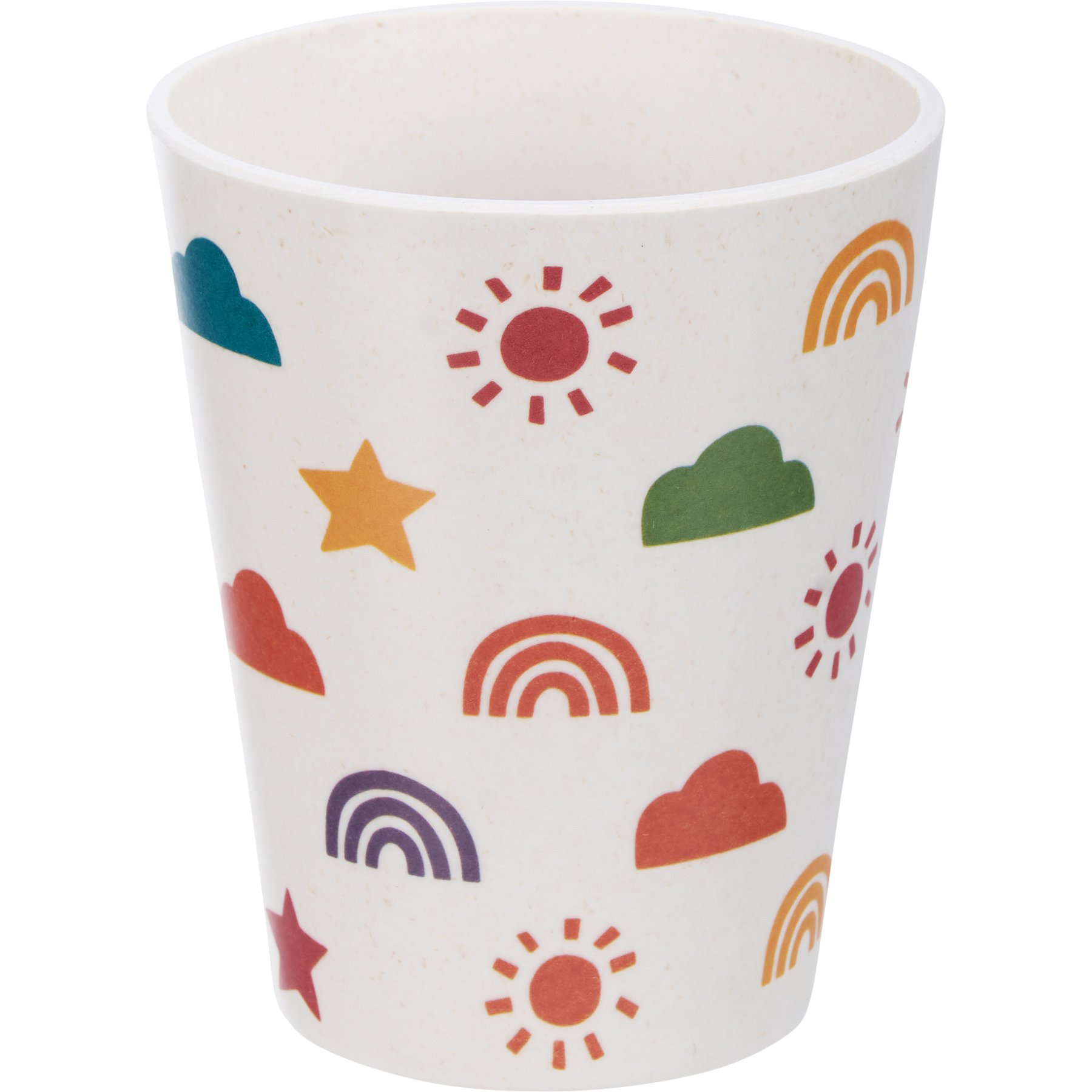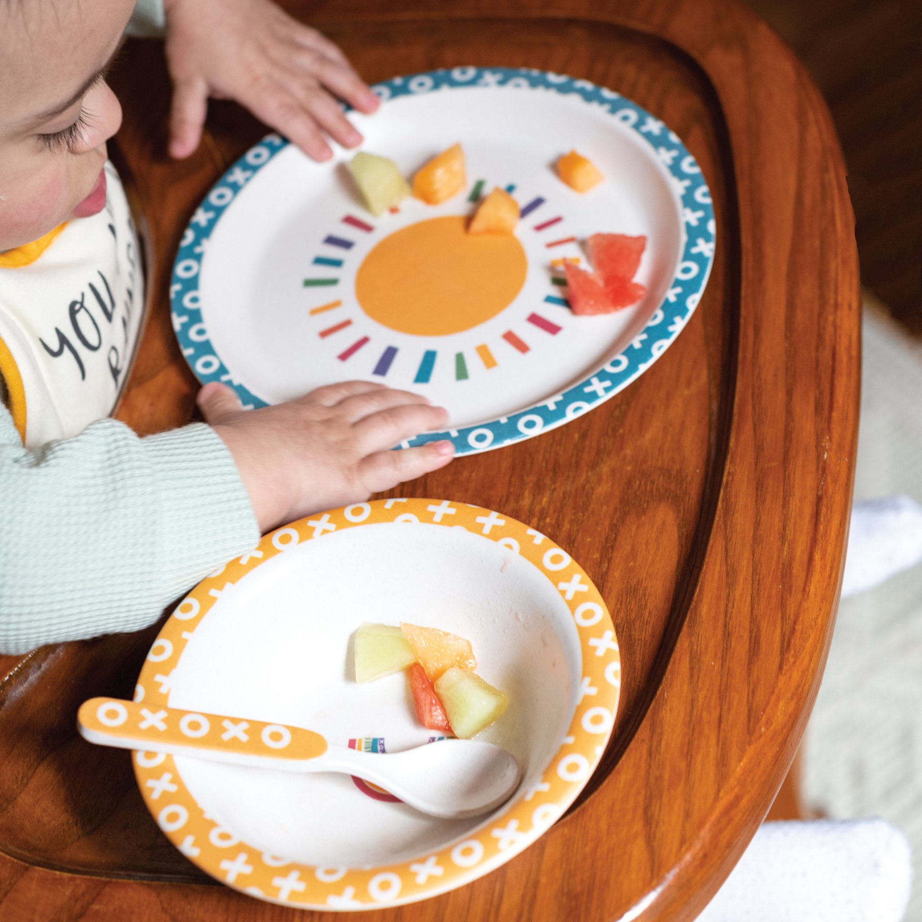 A cohesive meal set featuring a dishwasher safe bowl, plate, cup, fork, and spoon with block print rainbow designs. Meal set is BPA-free, thoughtfully made with bamboo fibers, and packaged in a high-quality kraft paper box making it ready for easy gifting. Another adorable addition to our exclusive Happy + Bright Collection. Our Sunshine And Rainbows meal set is not microwave safe.