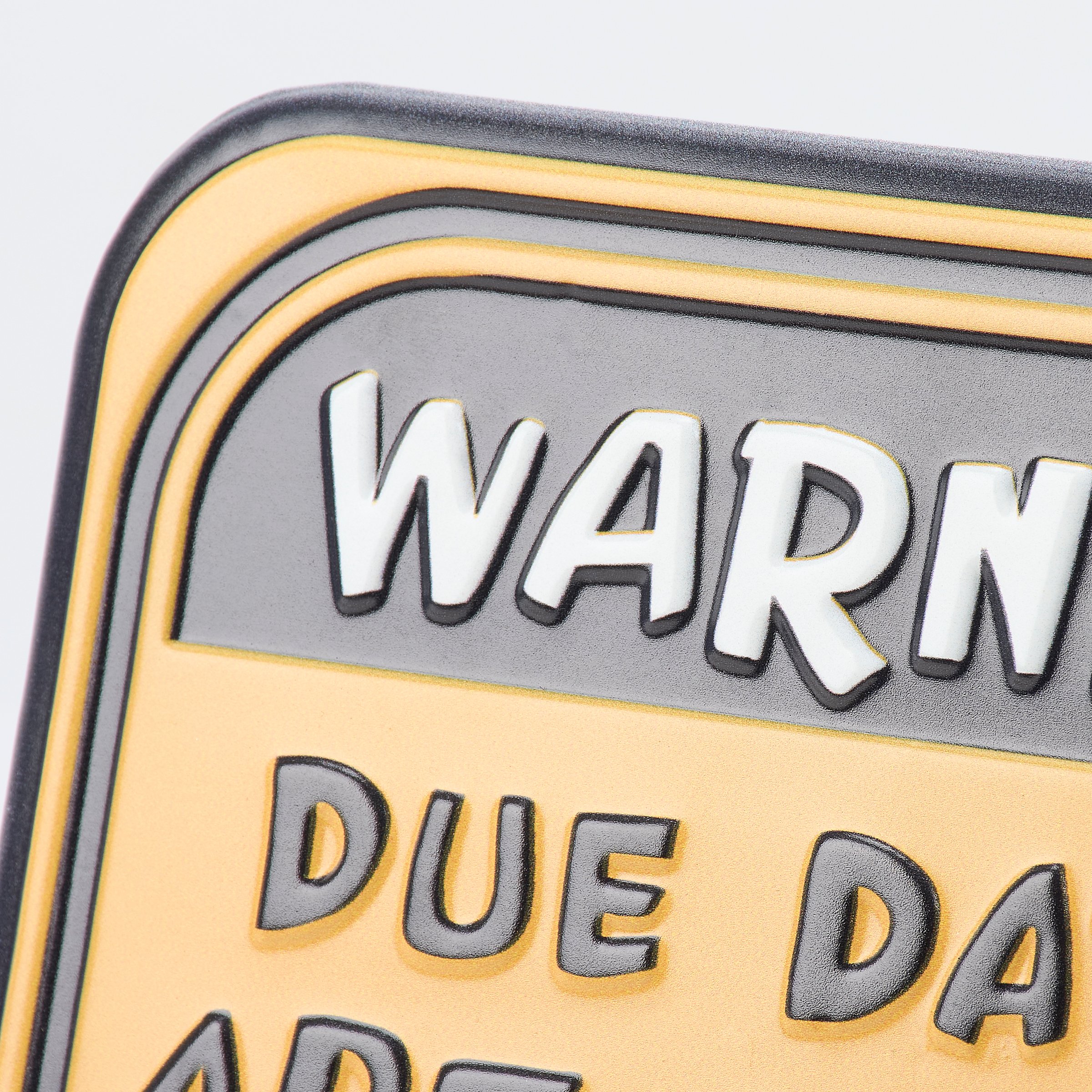 A metal décor piece from our Teacher Gift Collection displaying a hand illustrated warning sign design with a funny teacher inspired sentiment that reads "Warning - Due Dates Are Closer Than They Appear." This funny teacher sign features embossed details to accent the original hand illustrated art for added dimension. Our metal Due Dates Warning sign is easy to hang for display via the attached sawtooth hangers or free stand using easel on the back. A fun gift for teachers perfect for displaying in classrooms or home office.