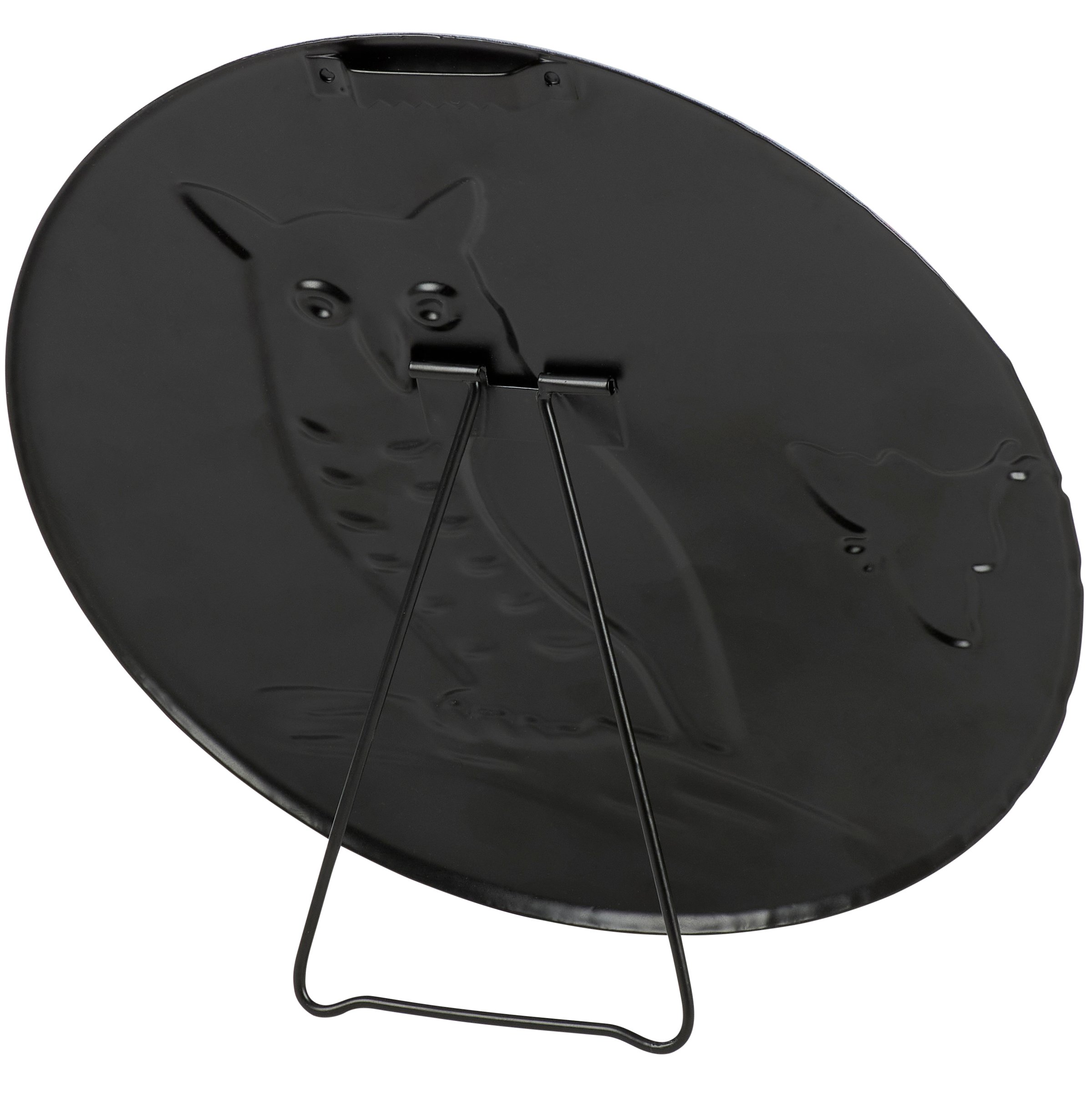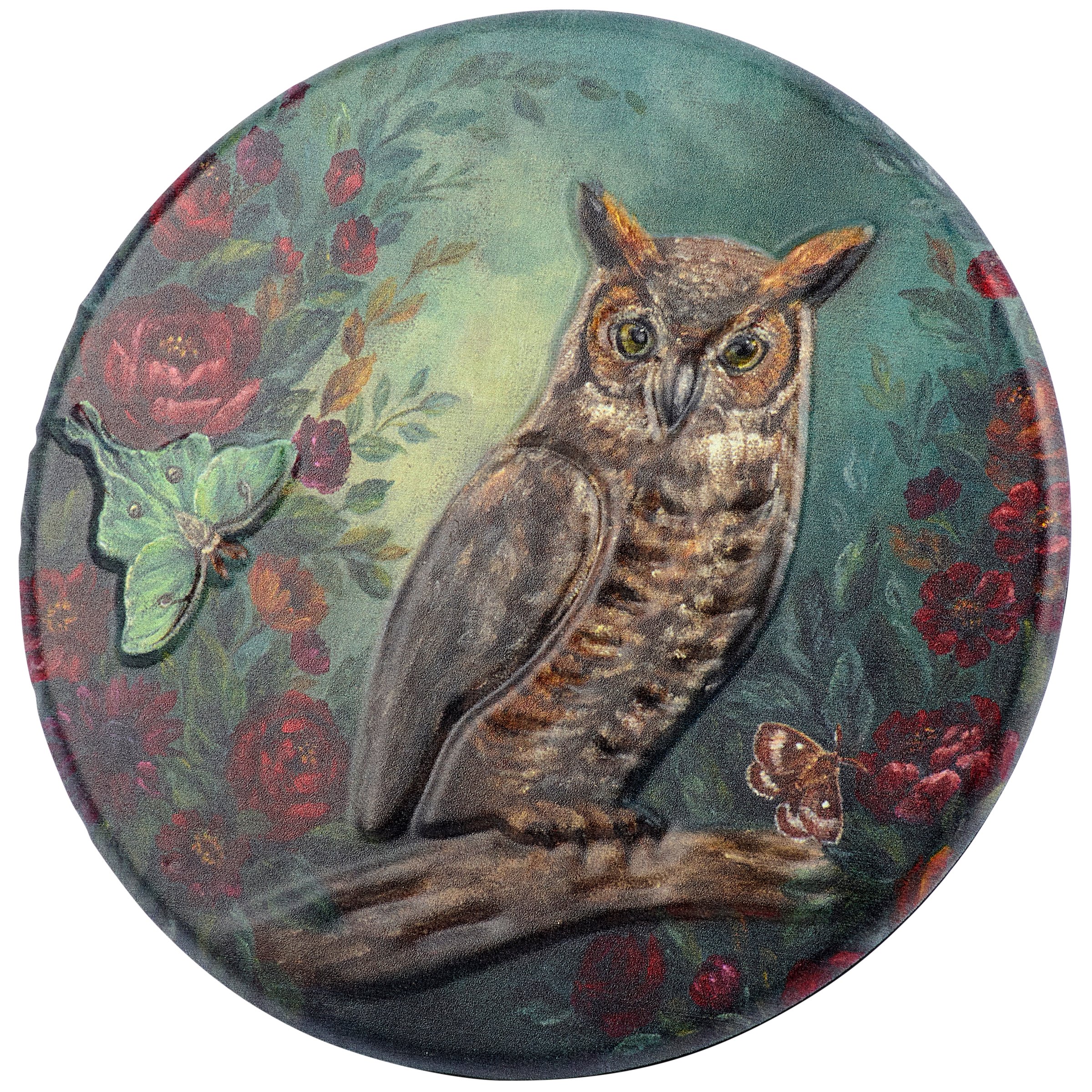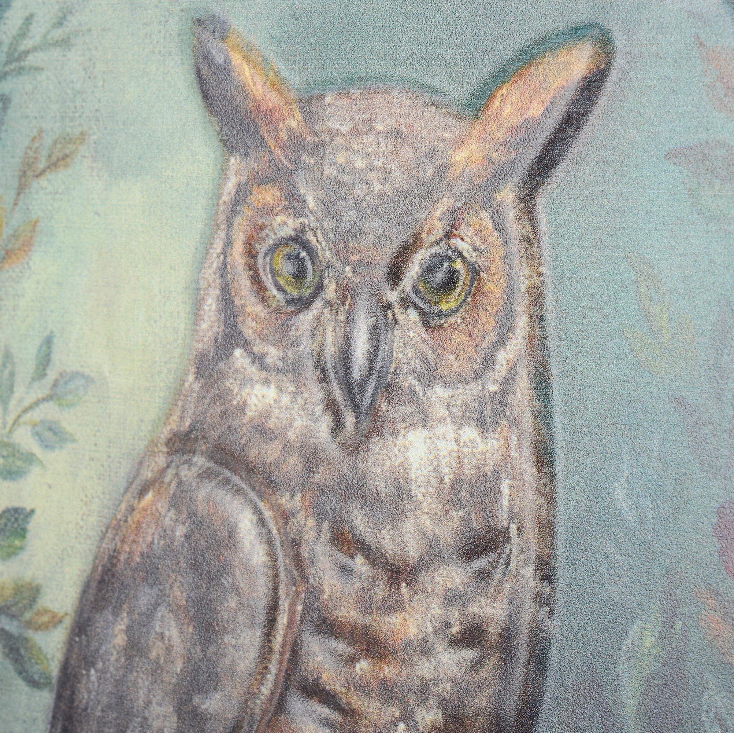 A metal décor piece from our Fall & Harvest Collection displaying a charming scene of an great horned owl surrounded by fall florals in a jewel tone color palette. Fall owl design is replicated from original artwork painted onto burlap canvas, giving the art a unique depth and texture. This fall sign features embossed details to accent the original hand painted art for added dimension. Our metal Great Horned Owl sitter is ready to hang for display via the attached sawtooth hanger or can free stand using easel on the back. A jewel tone fall home accent that easily adds seasonal style to any home or work space.
