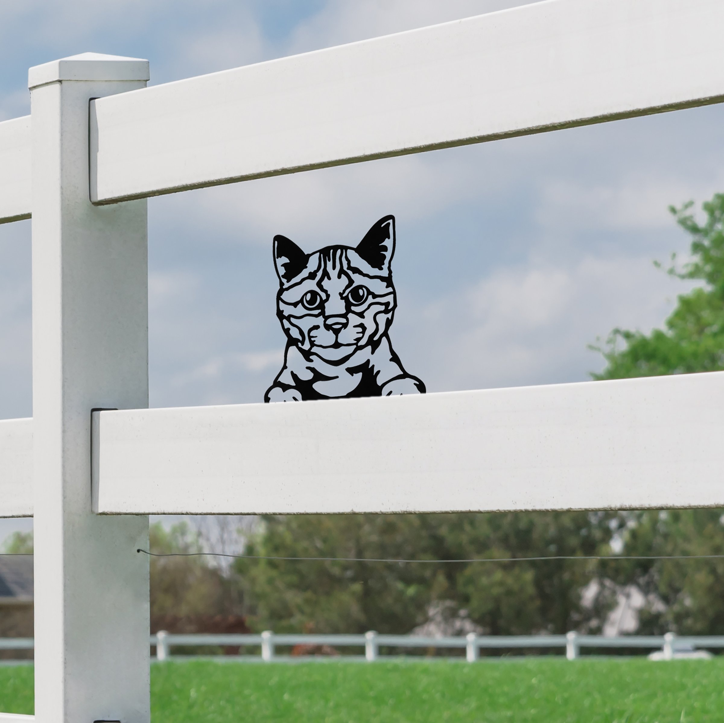 A durable metal décor piece from our Homestead Collection displaying a charming cutout design of a house cat. Metal cat art is designed to be displayed outside attached to a fence or railing for a fun "peeking" appearance. Outdoor metal decor includes pre-drilled holes and mounting hardware to easily hang for display. Our outdoor metal cat decor is a fun farm-themed home accent that easily adds personality to a fence or porch.
