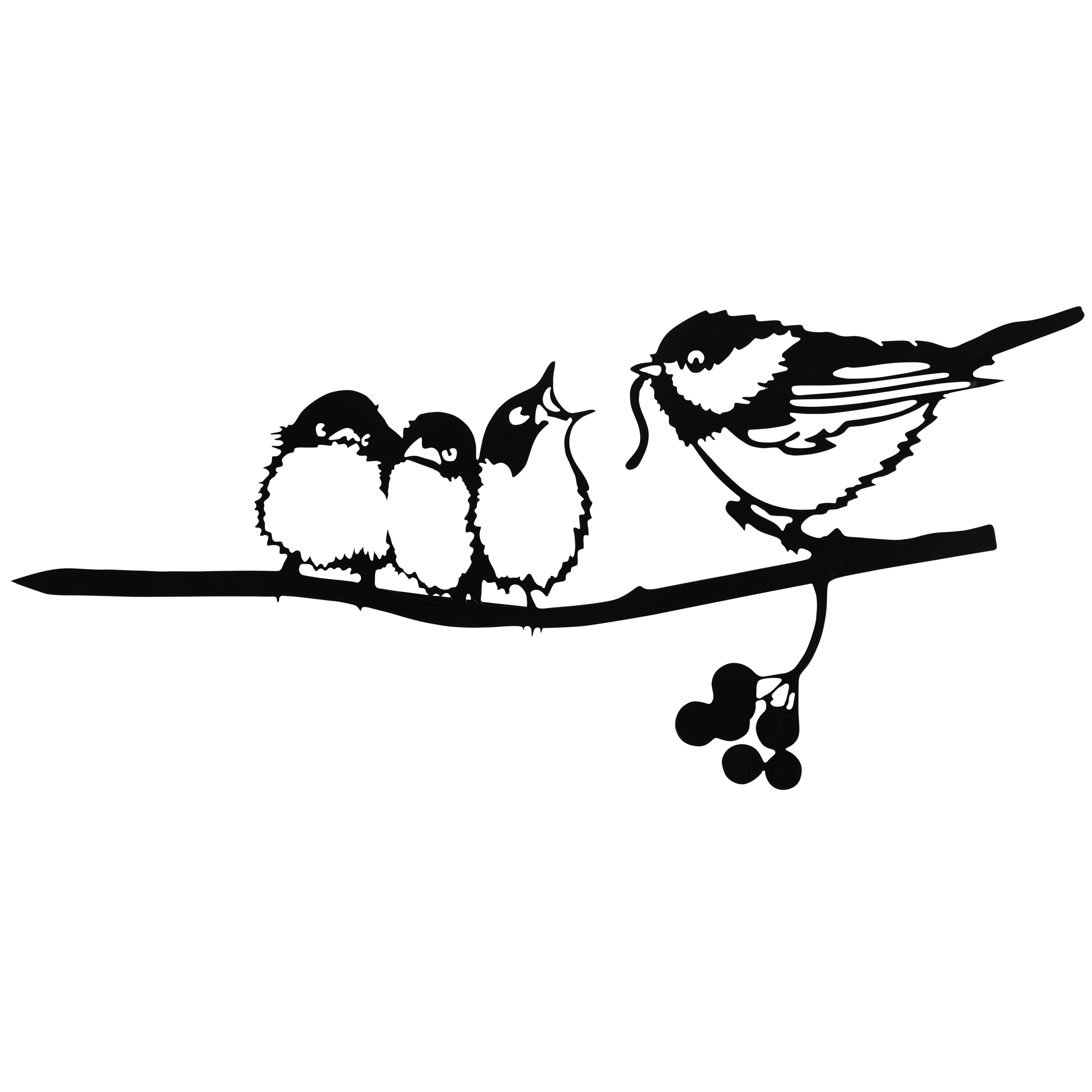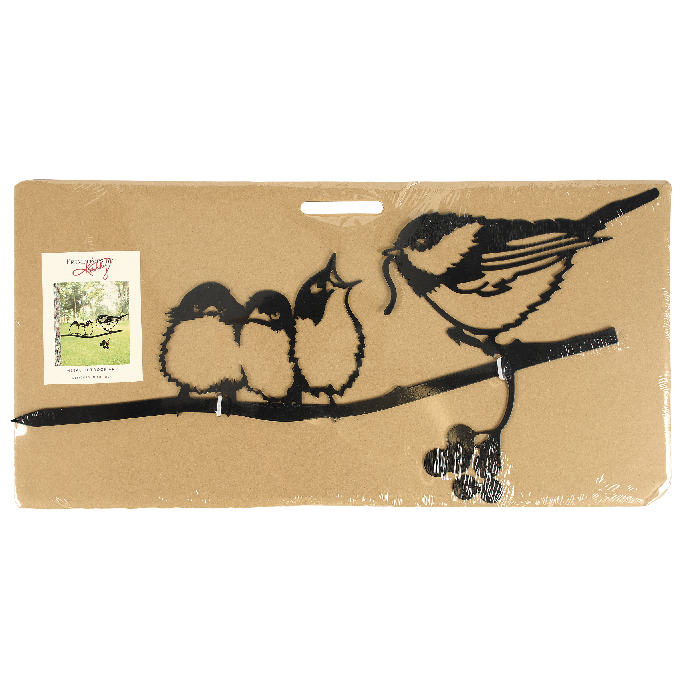 A durable metal décor piece from our Garden Collection displaying a charming cutout design of a branch with a chickadee feeding baby chickadees. Metal chickadee art is designed to be displayed outside using the spiked end to easily secure inside the hole of a post or a tree for a floating double-sided display. Our outdoor metal chickadees decor is a fun garden-themed home accent that easily adds personality to a tree or garden.
