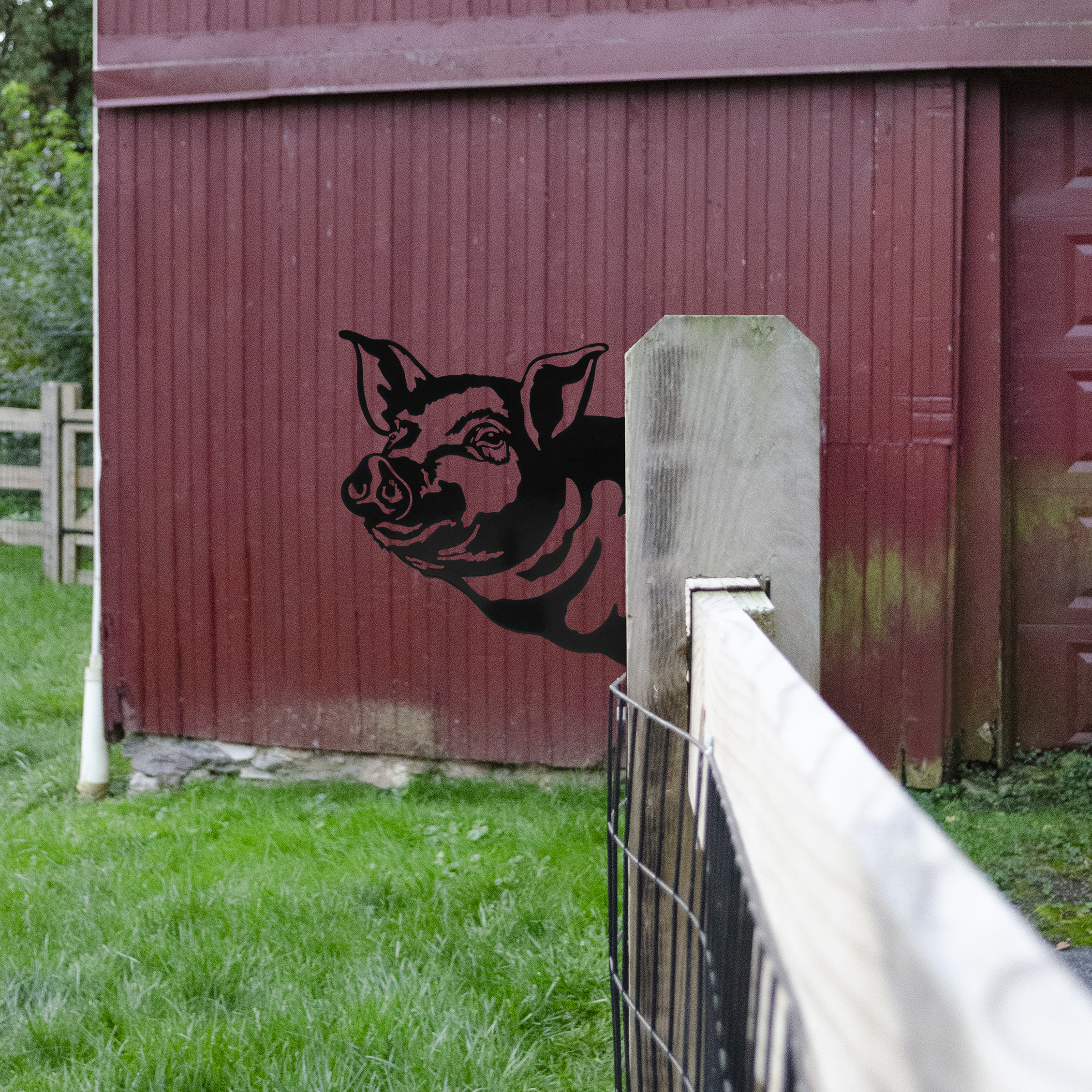 A durable metal décor piece from our Homestead Collection displaying a charming cutout design of a pig. Our metal pig decor is designed to be displayed outside attached to a post or corner for a fun "peeking" appearance. Outdoor art includes pre-drilled holes and mounting screws to easily hang for display. A fun farm-themed home accent that easily adds personality to a fence or porch.