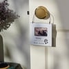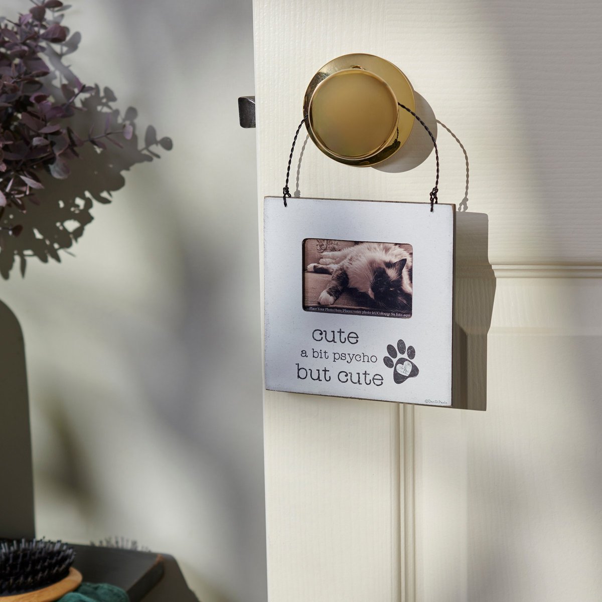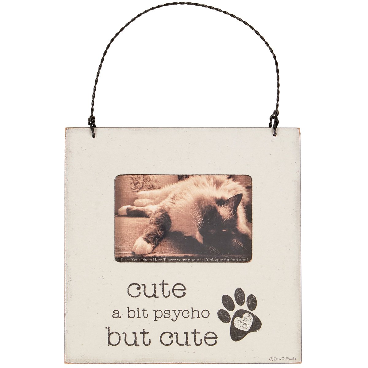 A small wooden frame from our Pet Collection displaying a rustic style with a paw print and heart design and a fun pet-themed sentiment that reads "Cute - A Bit Psycho - But Cute." Frame fits a 3 inch by 2 inch photo and can easily be replaced via clips on back. Our A Bit Psycho mini frame is easy to display using attached twisted wire hanger or magnet as well as the included removable peg to free-stand. A fun pet-themed gift perfect for displaying favorite memories as everyday home décor.
