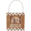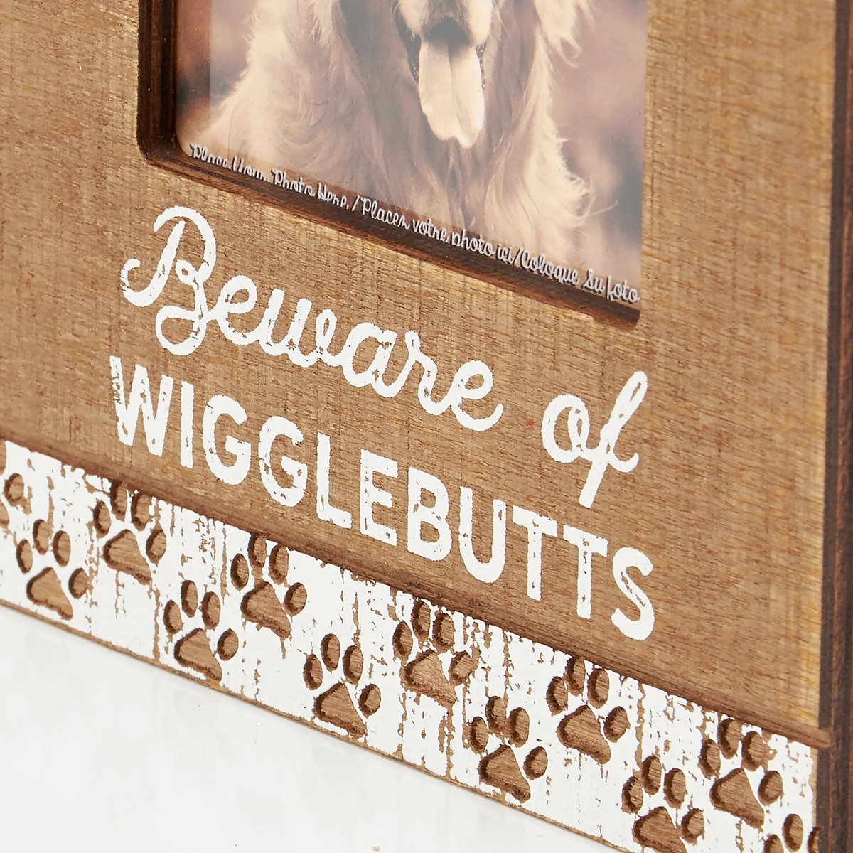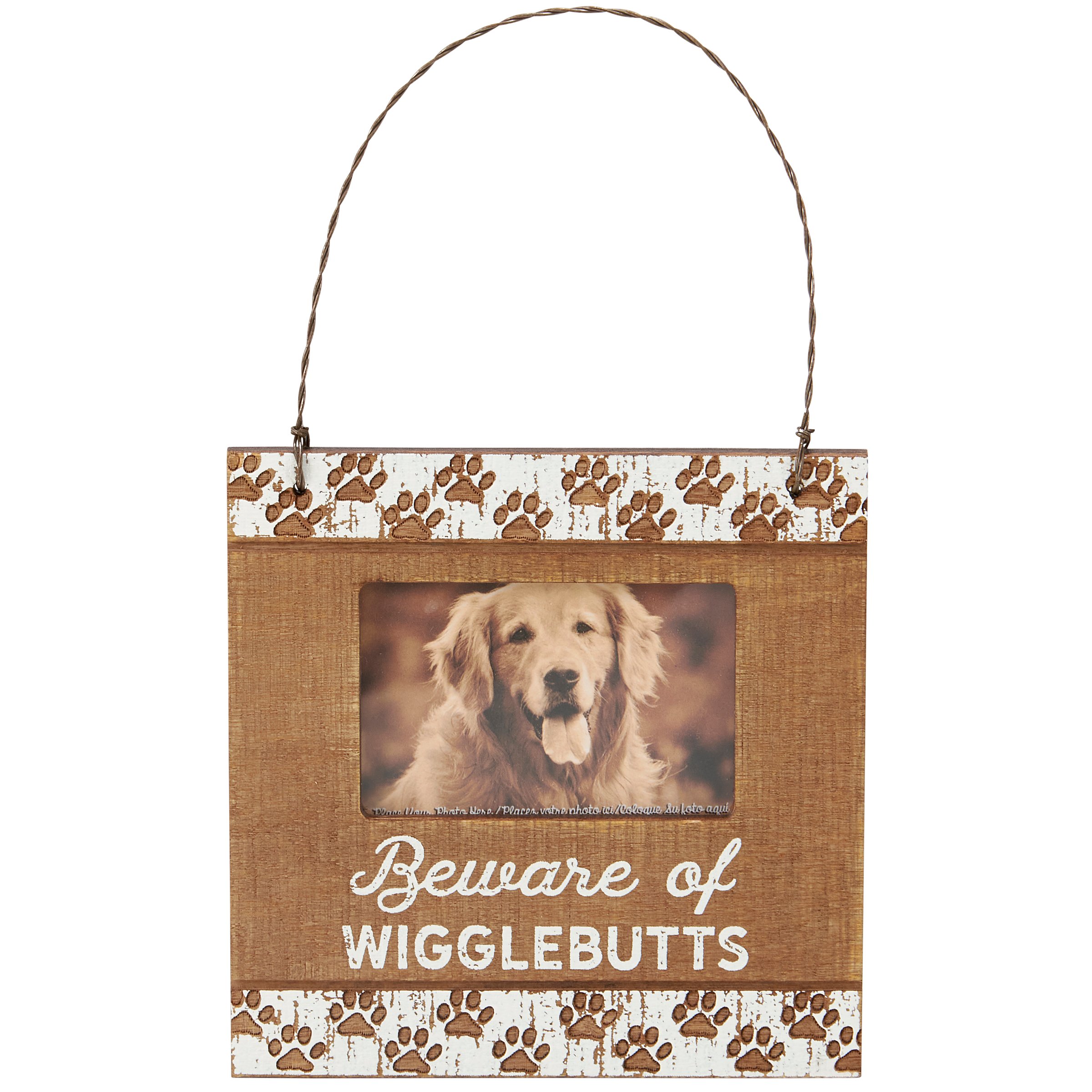 A small wooden frame from our Pet Collection displaying debossed paw print patterns on the top and bottom with distressed details and a fun pet-themed sentiment that reads "Beware Of Wigglebutts." Frame fits a 3 inch by 2 inch photo and can easily be replaced via clips on back. Our Wigglebutts mini frame is easy to display using attached twisted wire hanger or magnet on the back. A fun pet-themed gift perfect for displaying favorite memories as everyday home décor.