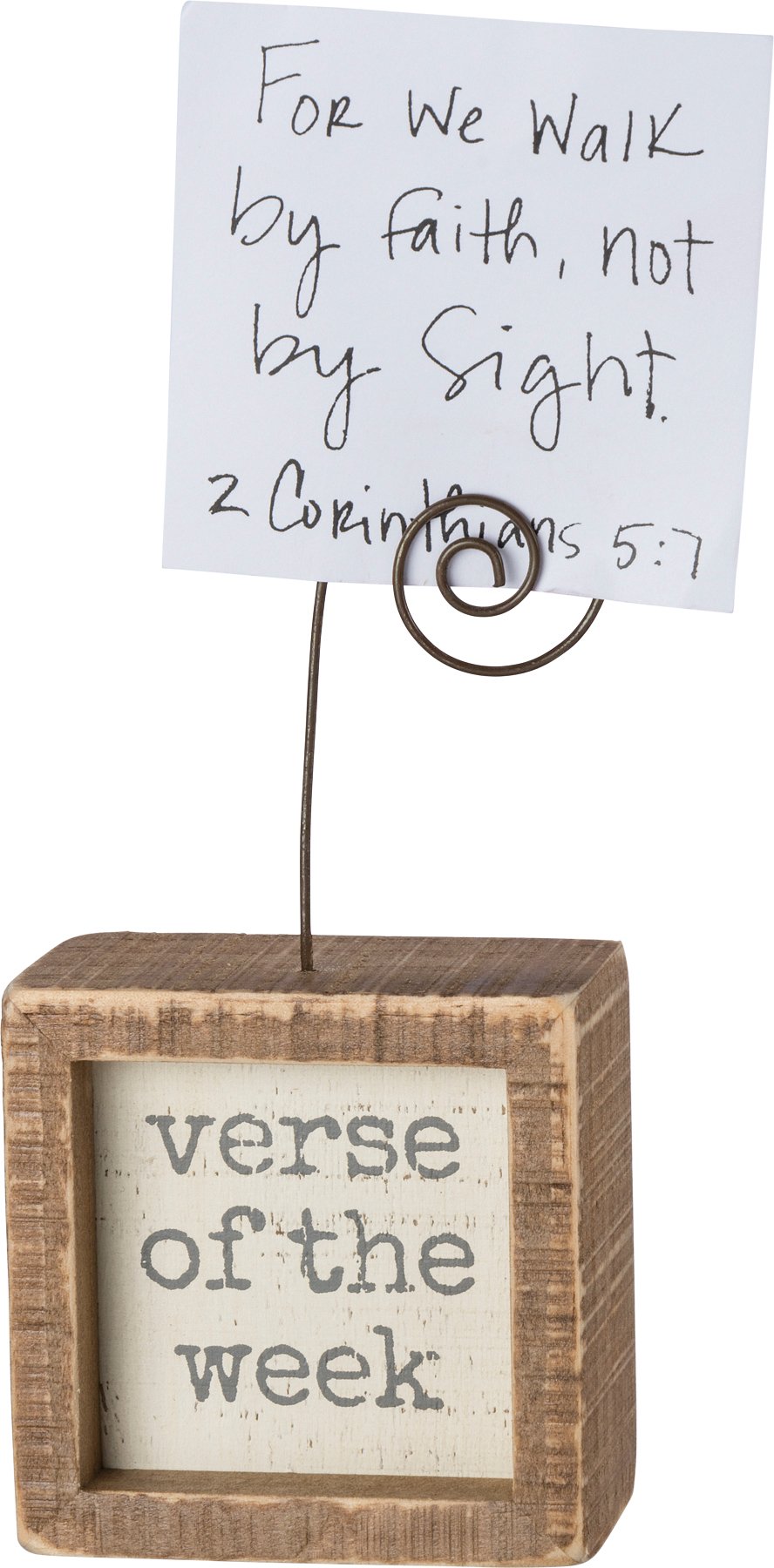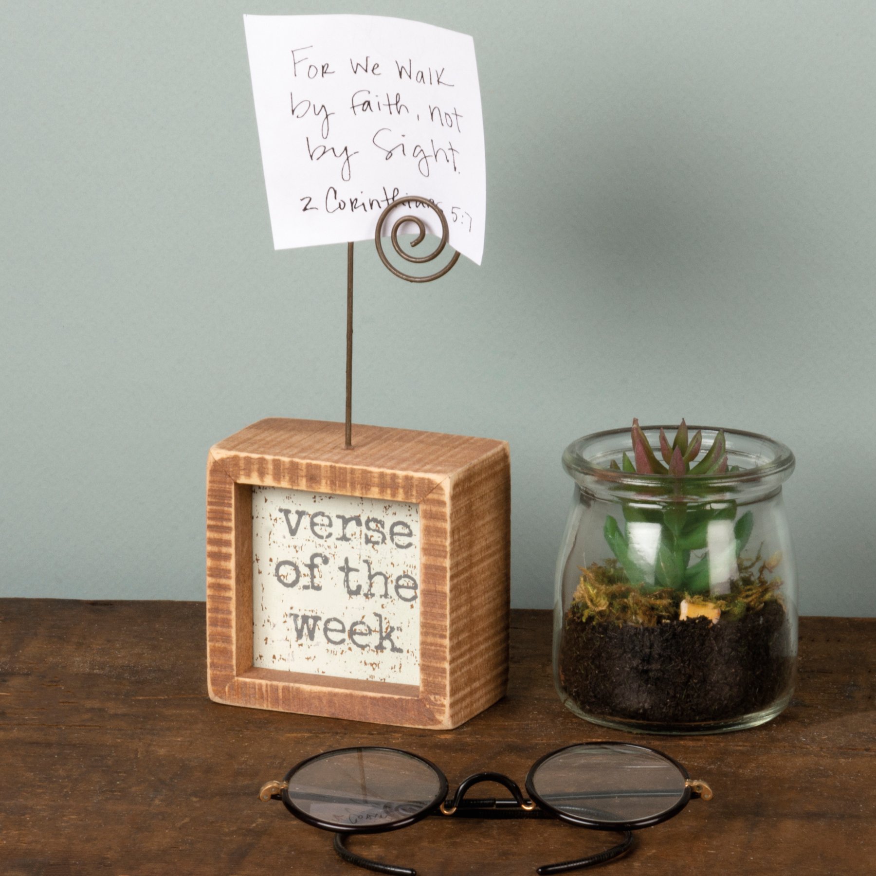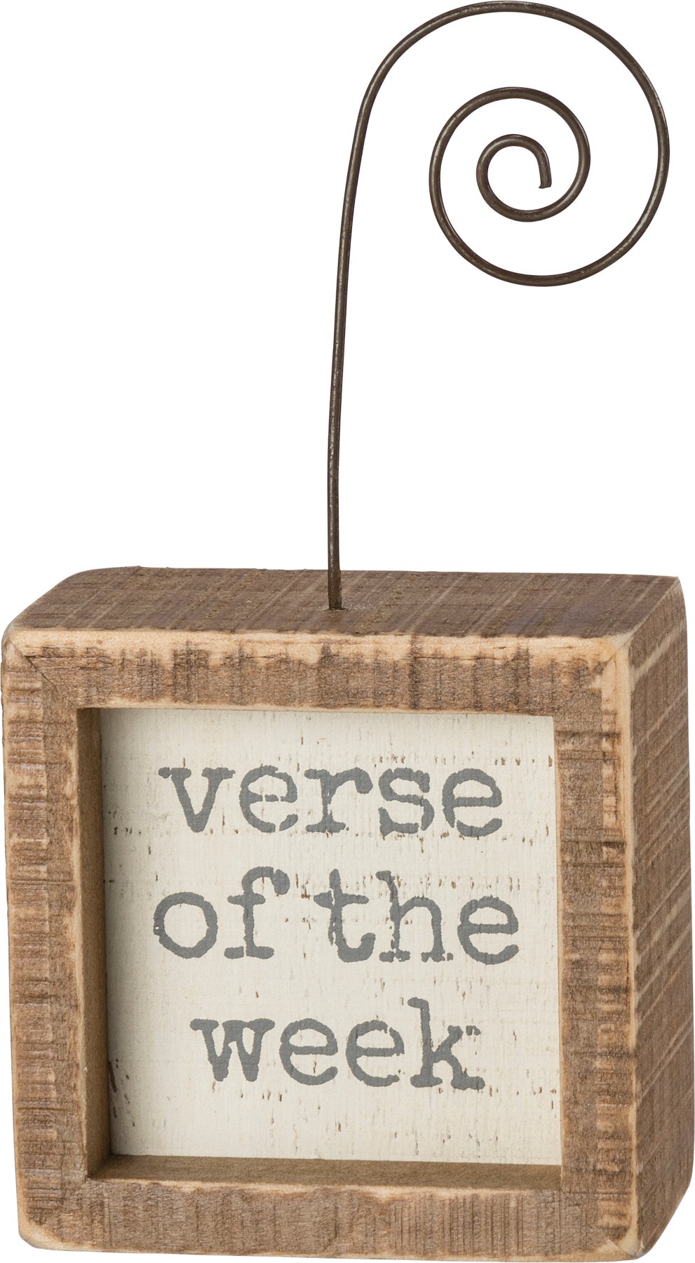 A wooden block photo holder lending an inset "Verse Of The Week" sentiment with top spiral wire for displaying a handwritten verse. Complements well with coordinating design pieces for a thoughtful gift set.