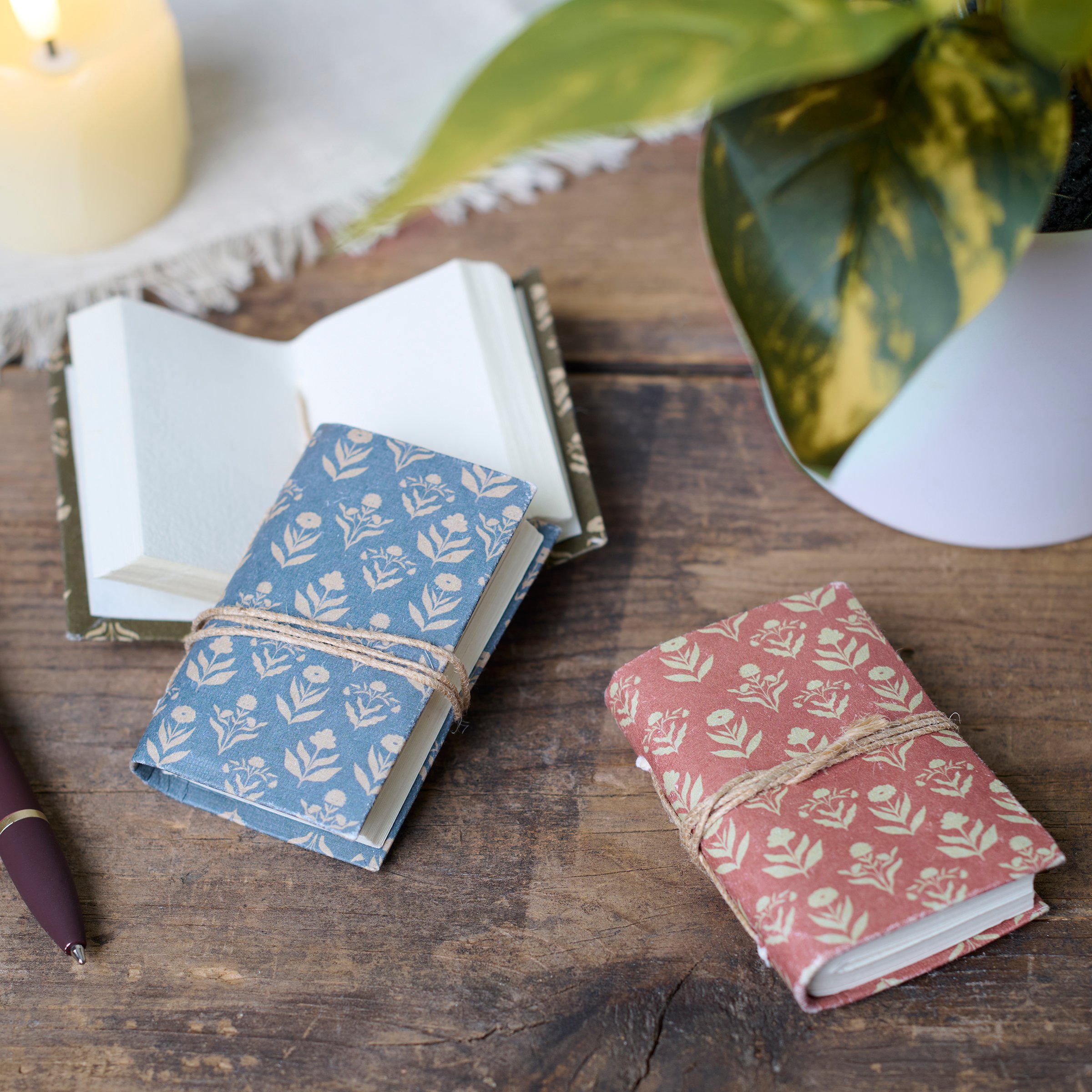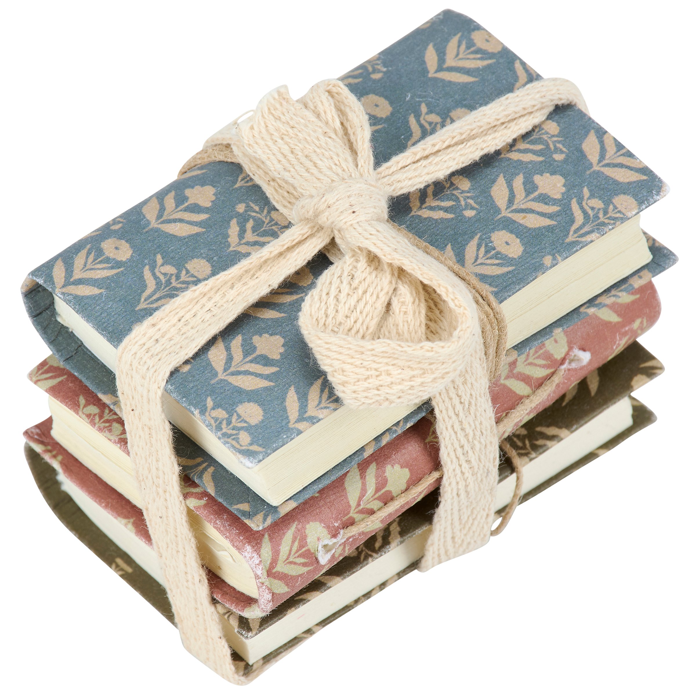 A set of 3 decorative mini notebooks from our Fall & Harvest Collection featuring double-sided designs displaying folk art inspired fall floral patterns on textured paper covers. Each fall folk art notebook contains 96 unlined pages to pen anything that is desired. Our mini Fall Folk Floral notebook set includes jute tie closures to keep each secure. Notebook set comes packaged stacked and wrapped with cotton tape making it great for gifting. A folk art fall gift perfect for any home office or desk.