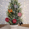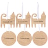 A set of 6 mini wooden ornaments from our Christmas Collection displaying hand illustrated cat inspired designs on each. Holiday cat designs include 3 different color cats wearing a Santa hat and winter scarf as well as 3 red circles displaying seasonal cat-themed sentiments that read "Meowy Christmas," "We're Cat People," and "Happy Pawlidays." Our Cat mini ornament set is easy to hang for display via attached white ribbon hangers. Christmas cat ornament set comes packaged together on a kraft card with hole to easily display all designs. A set of cat-themed holiday ornaments perfect for mini Christmas trees or for seasonal decorating.