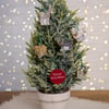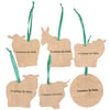 A set of 6 mini wooden ornaments from our Christmas Collection cut in the shape of the displayed farm animals wearing Christmas wreaths. Holiday farm animal designs include a donkey, sheep, and various cows replicated from original hand painted art as well as a red circle displaying a seasonal sentiment that reads "Happy Holidays." Our Christmas Animal mini ornament set is easy to hang for display via attached green ribbon hangers. Christmas farm animal ornament set comes packaged together on a kraft card with hole to easily display all designs. A set of farm-themed holiday ornaments perfect for mini Christmas trees or for seasonal decorating.