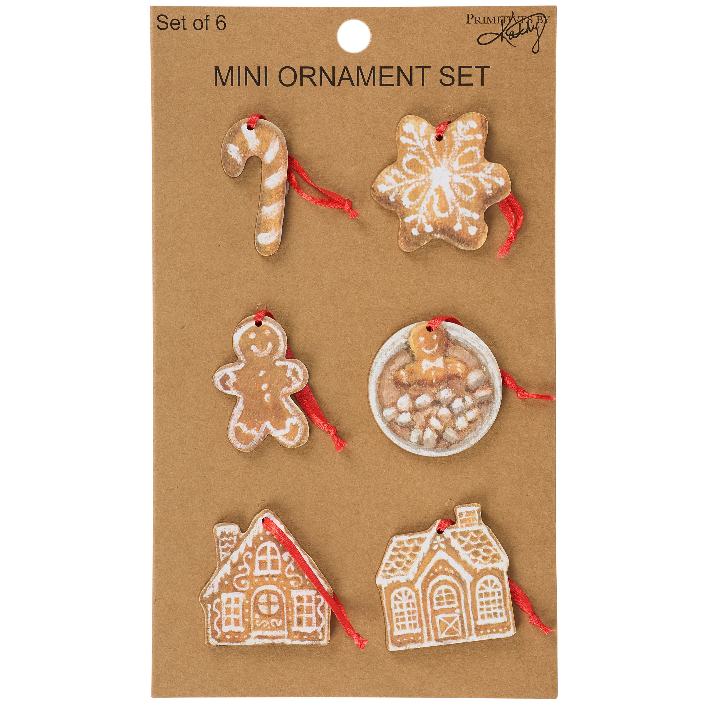 A set of 6 mini wooden ornaments from our Christmas Collection cut in the shape of the displayed gingerbread inspired designs replicated from original artwork painted onto burlap canvas, giving the art a unique depth and texture. Our Gingerbread mini ornament set is easy to hang for display via attached red ribbon hangers. Gingerbread cookie ornament set comes packaged together on a kraft card with hole to easily display all designs. A set of gingerbread-themed ornaments perfect for mini Christmas trees or for seasonal decorating.