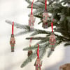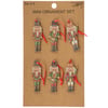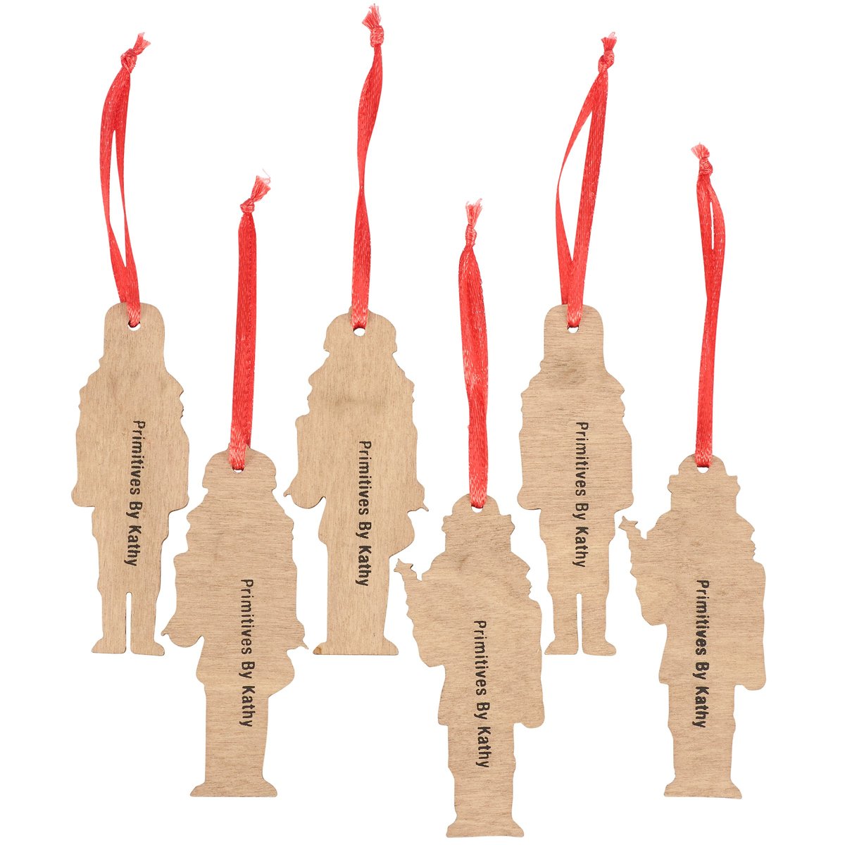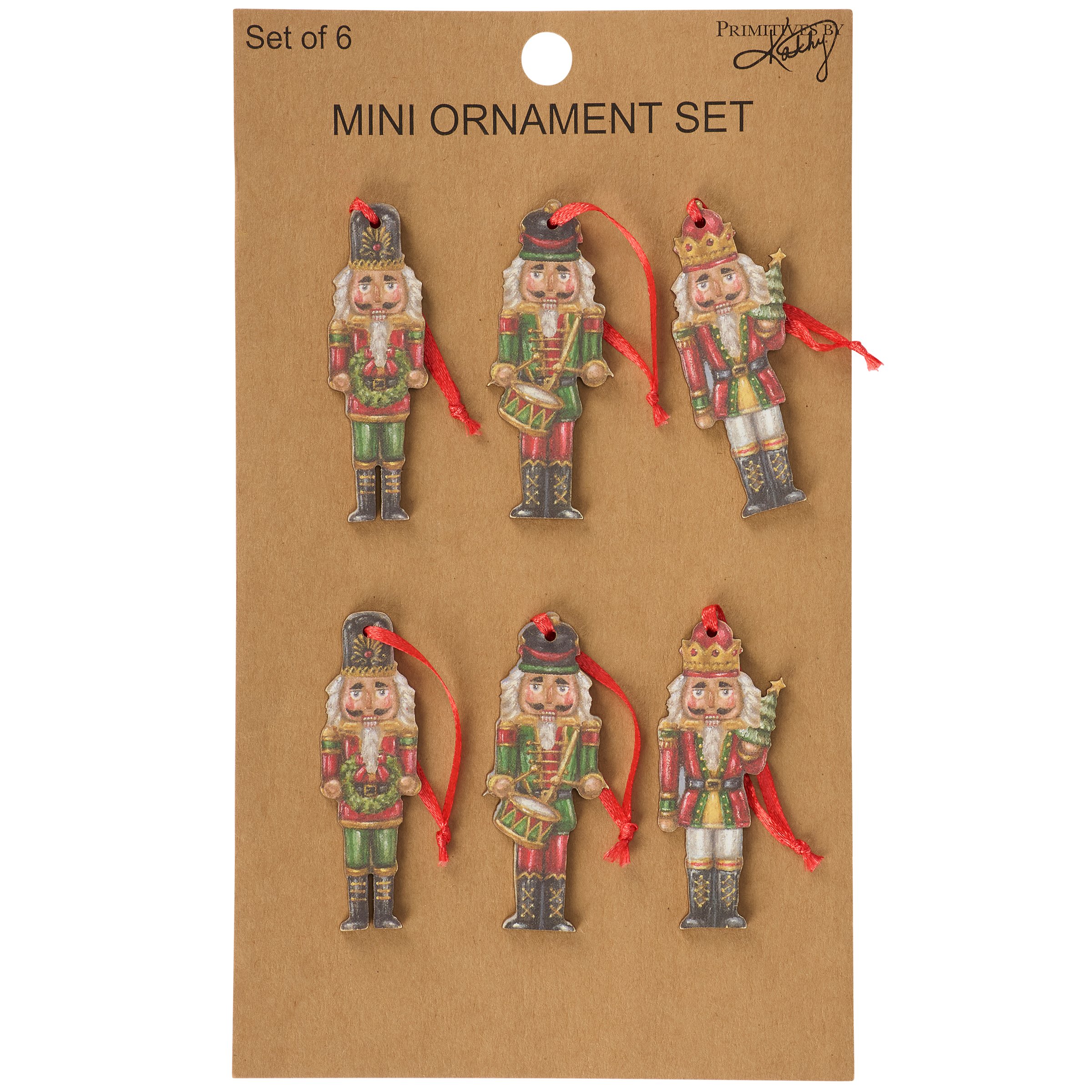 A set of 6 mini wooden ornaments from our Christmas Collection cut in the shape of the displayed nutcracker inspired designs replicated from original artwork painted onto burlap canvas, giving the art a unique depth and texture. Our Nutcracker mini ornament set is easy to hang for display via attached red ribbon hangers. Nutcracker ornament set comes packaged together on a kraft card with hole to easily display all designs. A set of nutcracker-themed ornaments perfect for mini Christmas trees or for seasonal decorating.