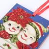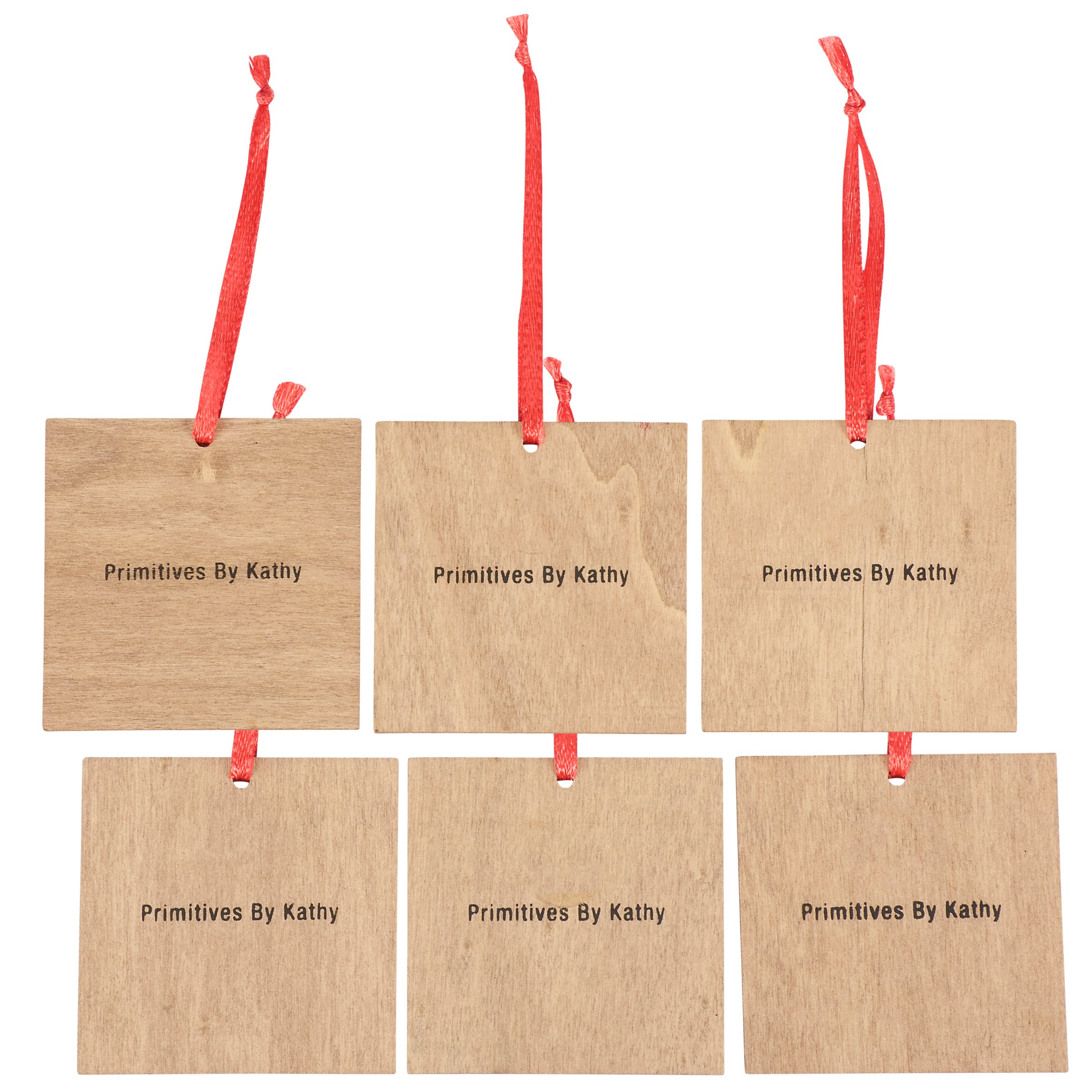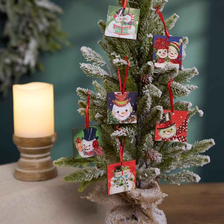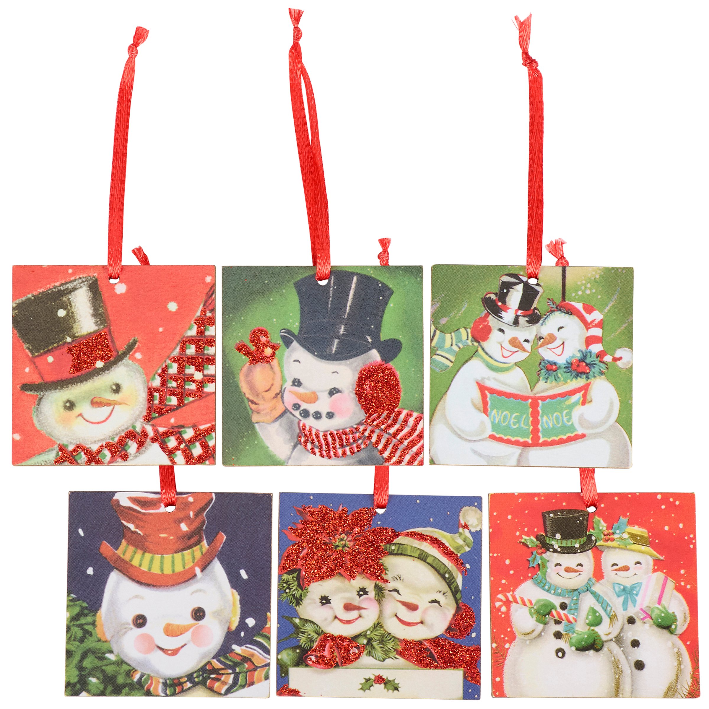 A set of 6 mini wooden ornaments from our Christmas Collection displaying retro art of jolly snowmen with red glitter accents throughout. Our Retro Snowmen mini ornament set is easy to hang for display via attached red ribbon hangers. Retro ornament set comes packaged together on a kraft card with hole to easily display all designs. A set of retro holiday ornaments perfect for mini Christmas trees or for seasonal decorating.