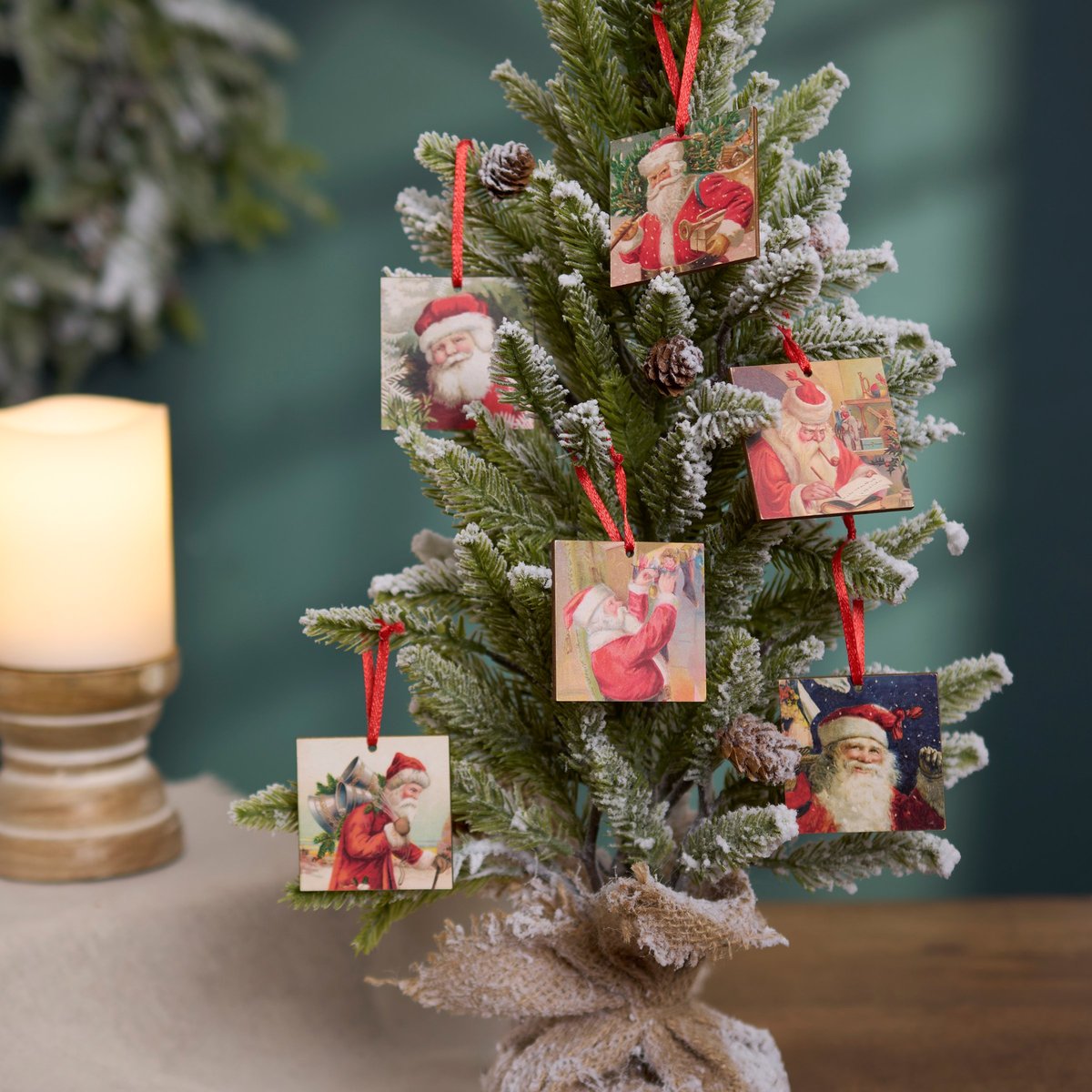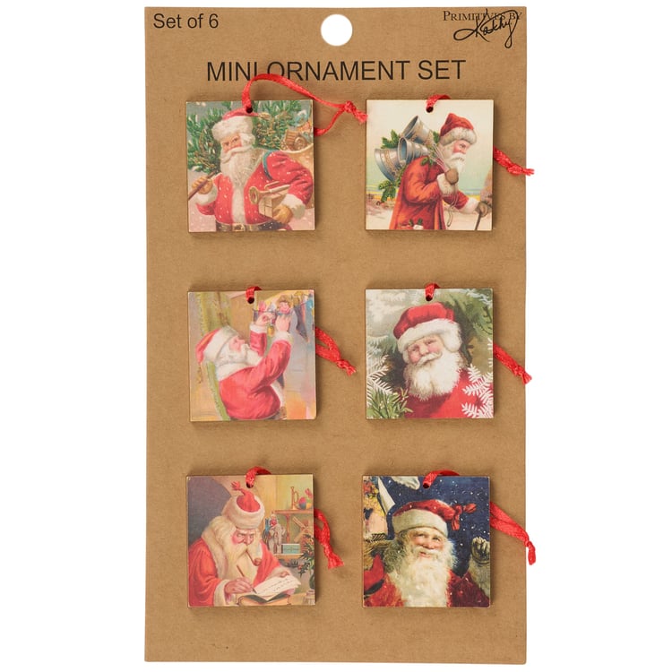A set of 6 mini wooden ornaments from our Christmas Collection displaying various retro art of Santa. Our Santa mini ornament set is easy to hang for display via attached red ribbon hangers. Retro ornament set comes packaged together on a kraft card with hole to easily display all designs. A set of retro holiday ornaments perfect for mini Christmas trees or for seasonal decorating.