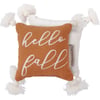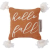 A mini pillow from our Fall & Harvest Collection displaying a bohemian inspired design with "Hello Fall" sentiment on autumn brown background. Our Hello Fall pillow features 1" poms on each corner and velvet back for added interest with polyester filling.