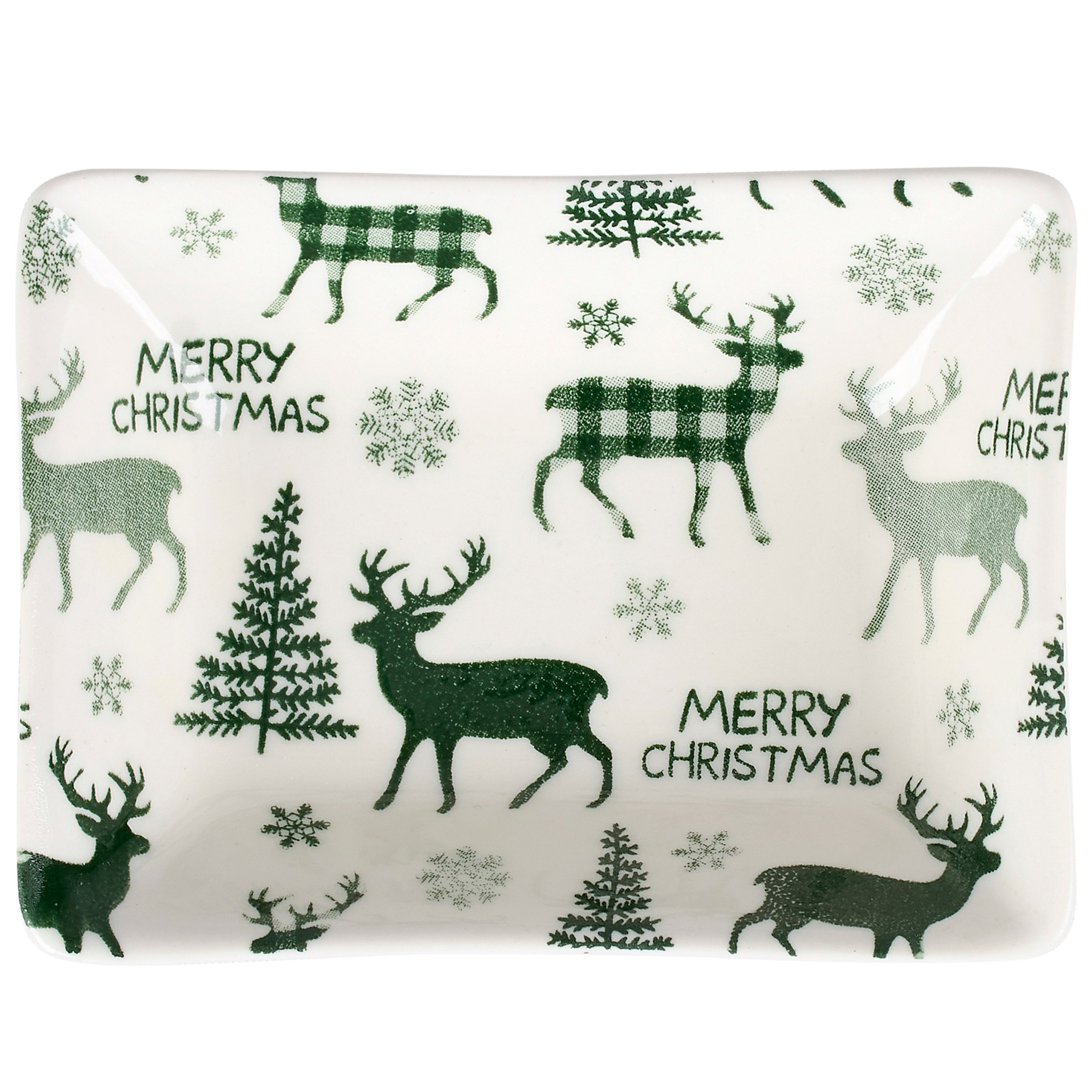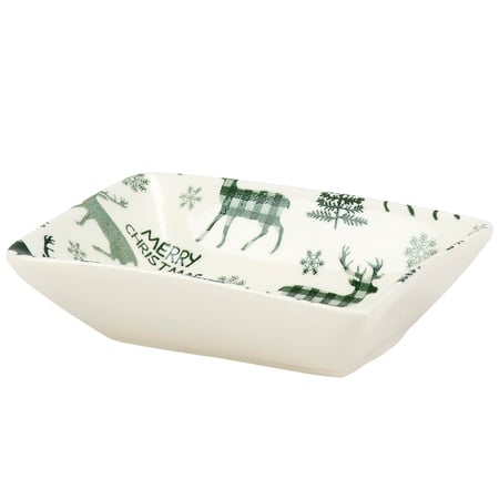 A small durable stoneware tray from our Christmas Collection featuring a winter green design inside of the tray displaying a pattern of deer, pine trees, snowflakes, and "Merry Christmas" sentiments. Our Cabin Deer mini tray is conveniently microwave, oven, dishwasher, and food safe for easy use. A piece of stoneware dishware perfect for winter themed tablescapes.