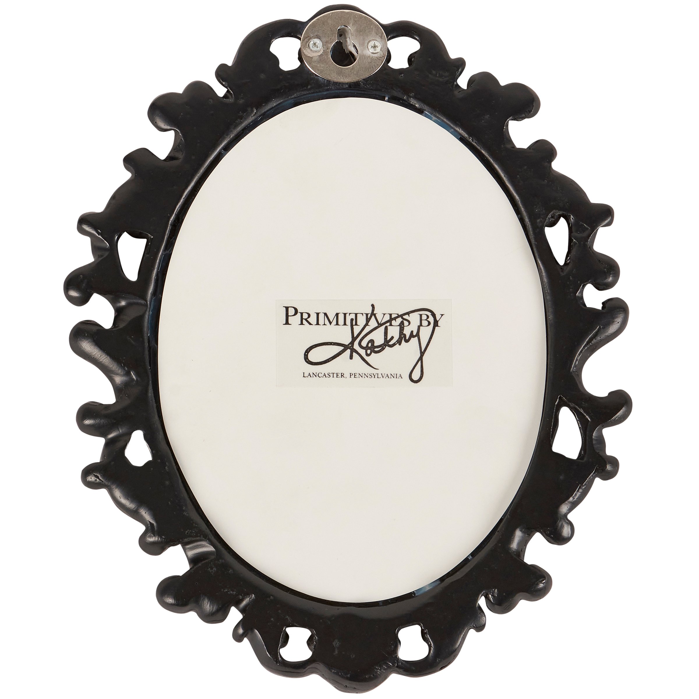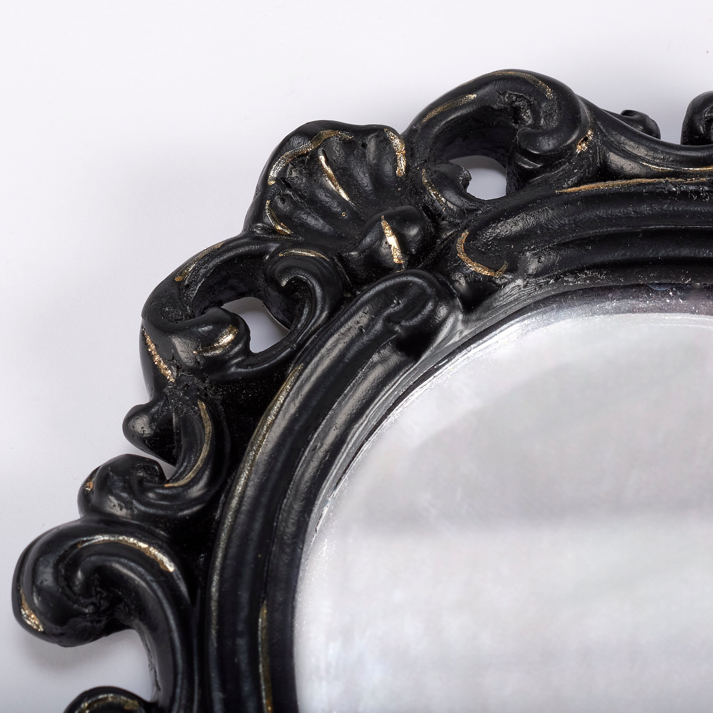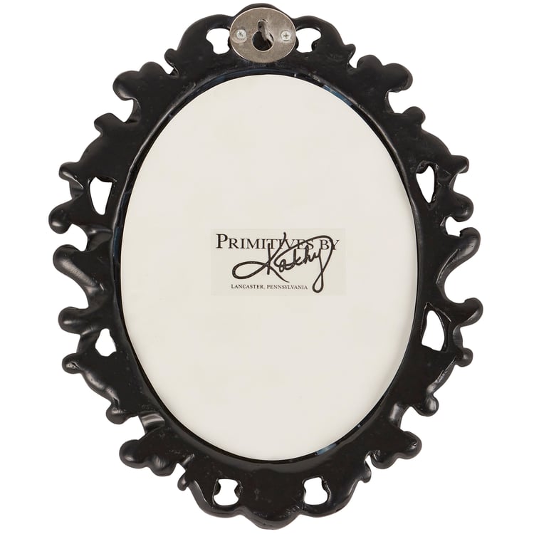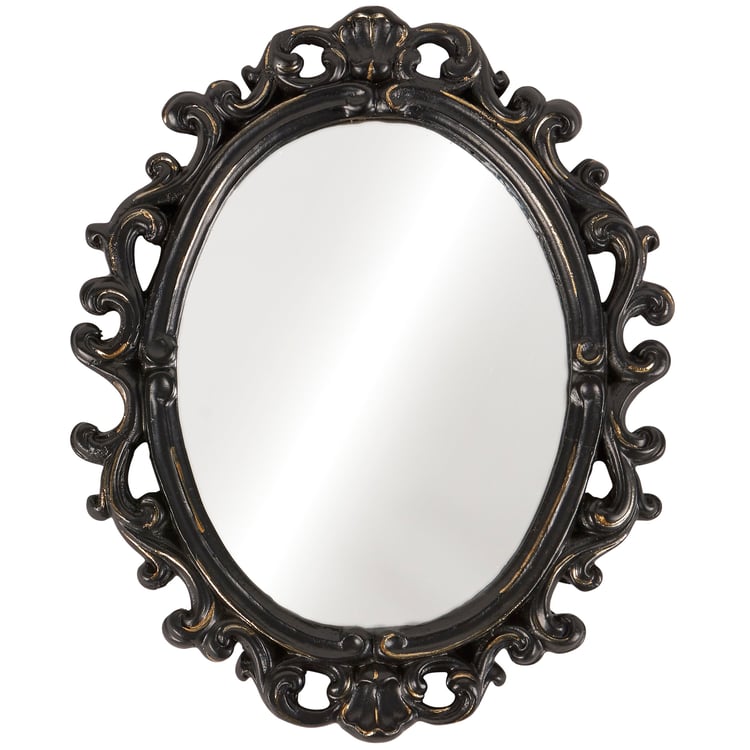A small decorative mirror from our Moody Collection displaying an oval shape and a filigree inspired black border with distressed details and antique accents. Our small Black Filigree mirror is easy to hang for display using the metal keyhole slot attached to the back of the frame. A vintage home accent perfect for everyday display.