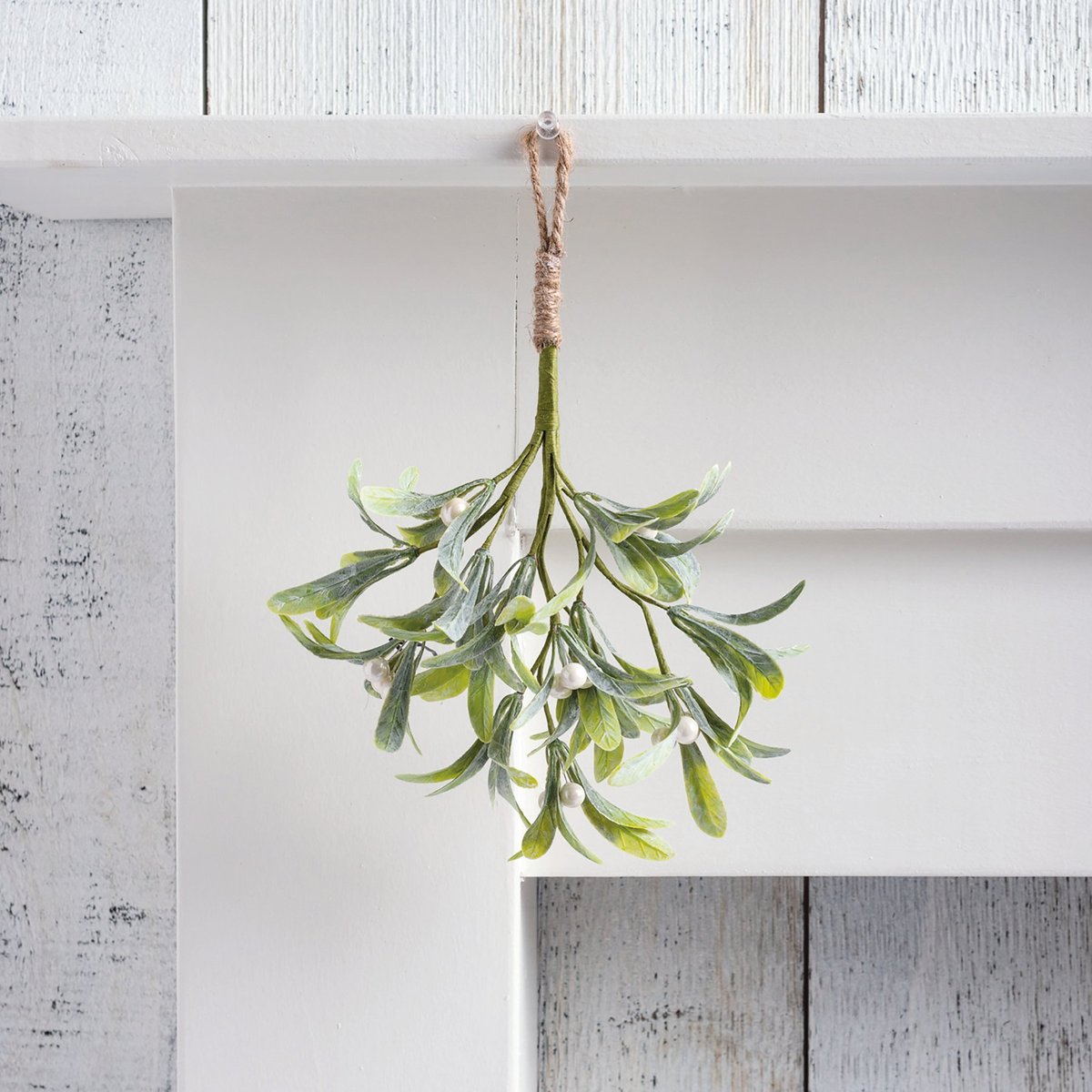 A festive mistletoe cluster for the holidays that's sure to make spirits bright! Contains a top jute loop for easy hanging.