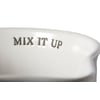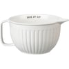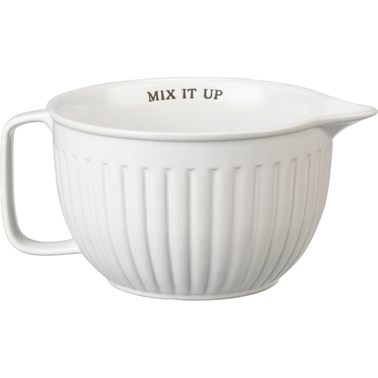 A stoneware batter bowl lending a debossed "Mix It Up" sentiment. White bowl features ribbed texture and includes handle and spout for easy pouring. Sentiment displayed across inside rim of bowl in slate gray. Microwave, oven, dishwasher and food safe. This item makes a perfect addition to a farmhouse aesthetic and coordinates well with other pieces in collection!