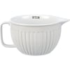 A stoneware batter bowl lending a debossed "Stir" sentiment. White bowl features ribbed texture and includes handle and spout for easy pouring. Sentiment displayed across inside rim of bowl in slate gray. Microwave, oven, dishwasher and food safe. This item makes a perfect addition to a farmhouse aesthetic and coordinates well with other pieces in collection!