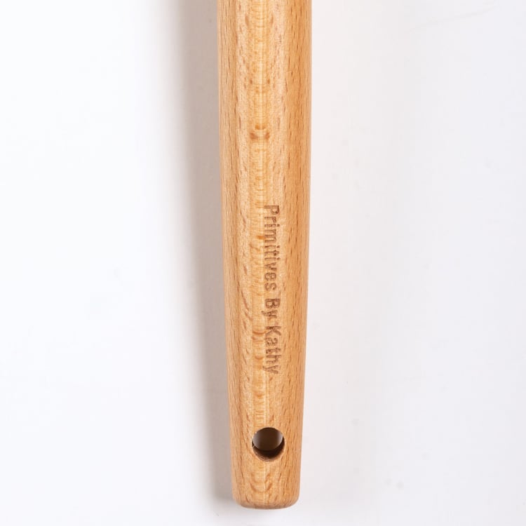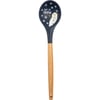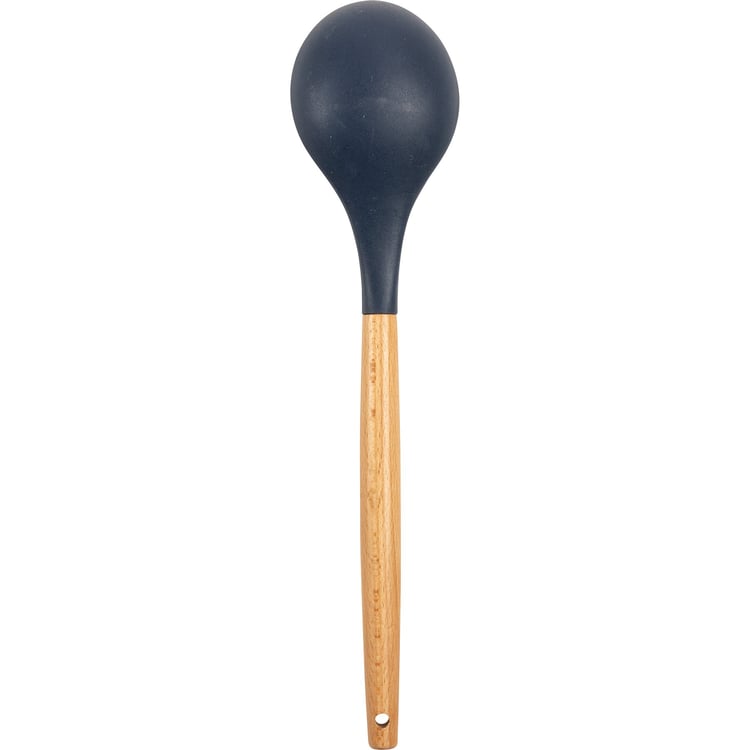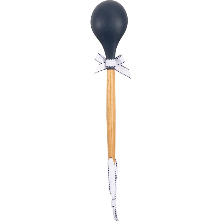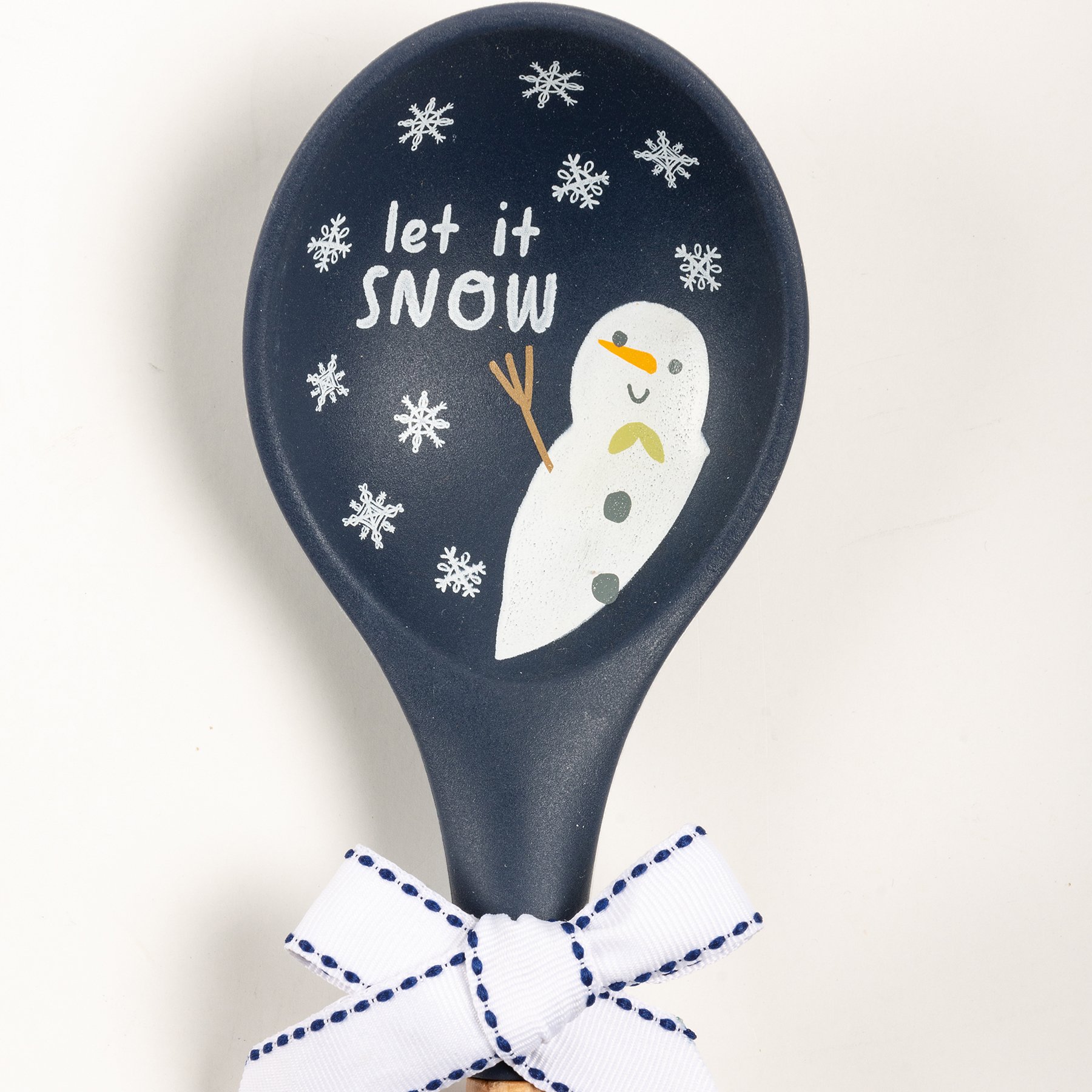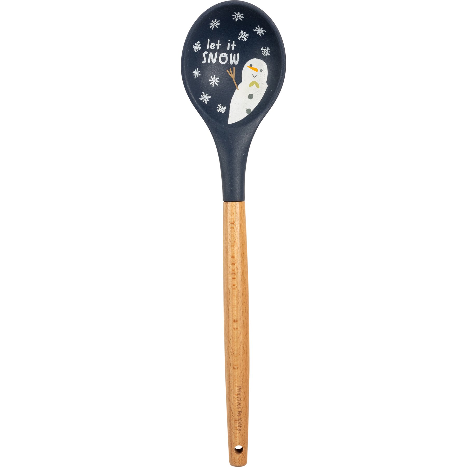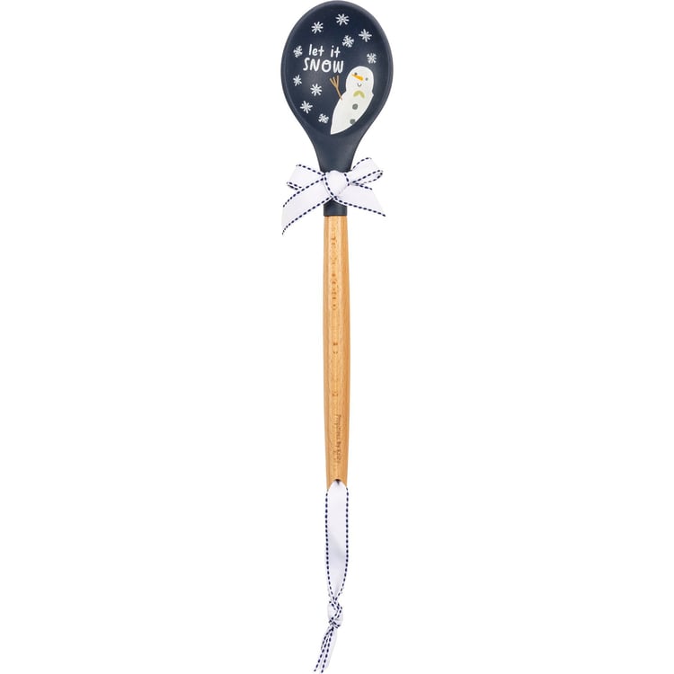 A silicone mixing spoon with a wooden handle. Features "Let It Snow" sentiment with snowman and snowflake designs and an all-over blue color palette. Our Let It Snow mixing spoon features a logo engraved into wooden handle and a decorative bow and ribbon for hanging. Hand-wash recommended; not microwave safe.