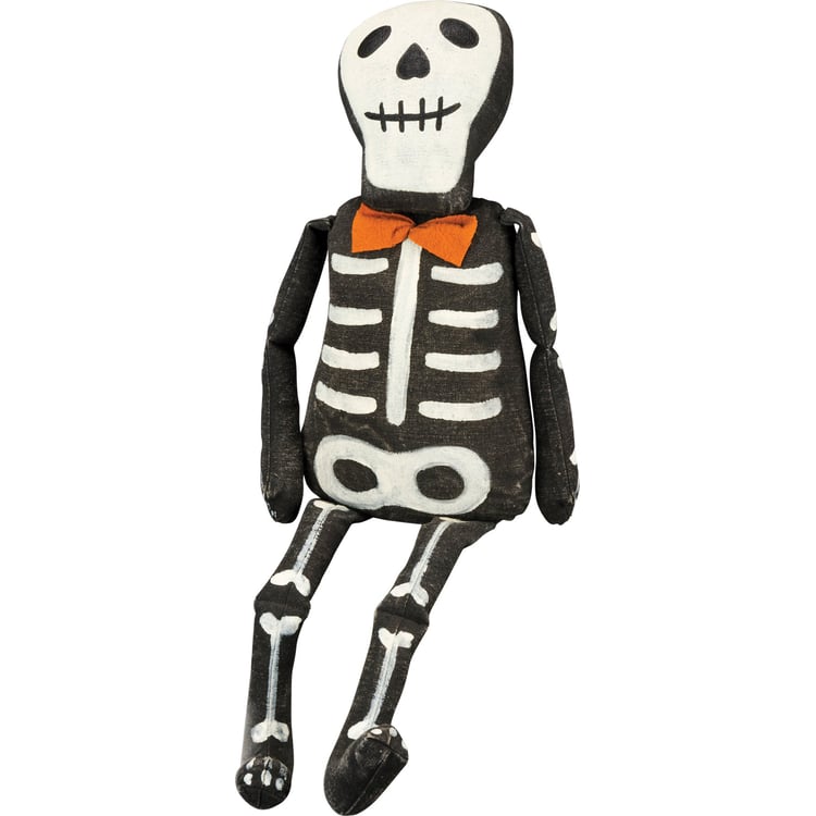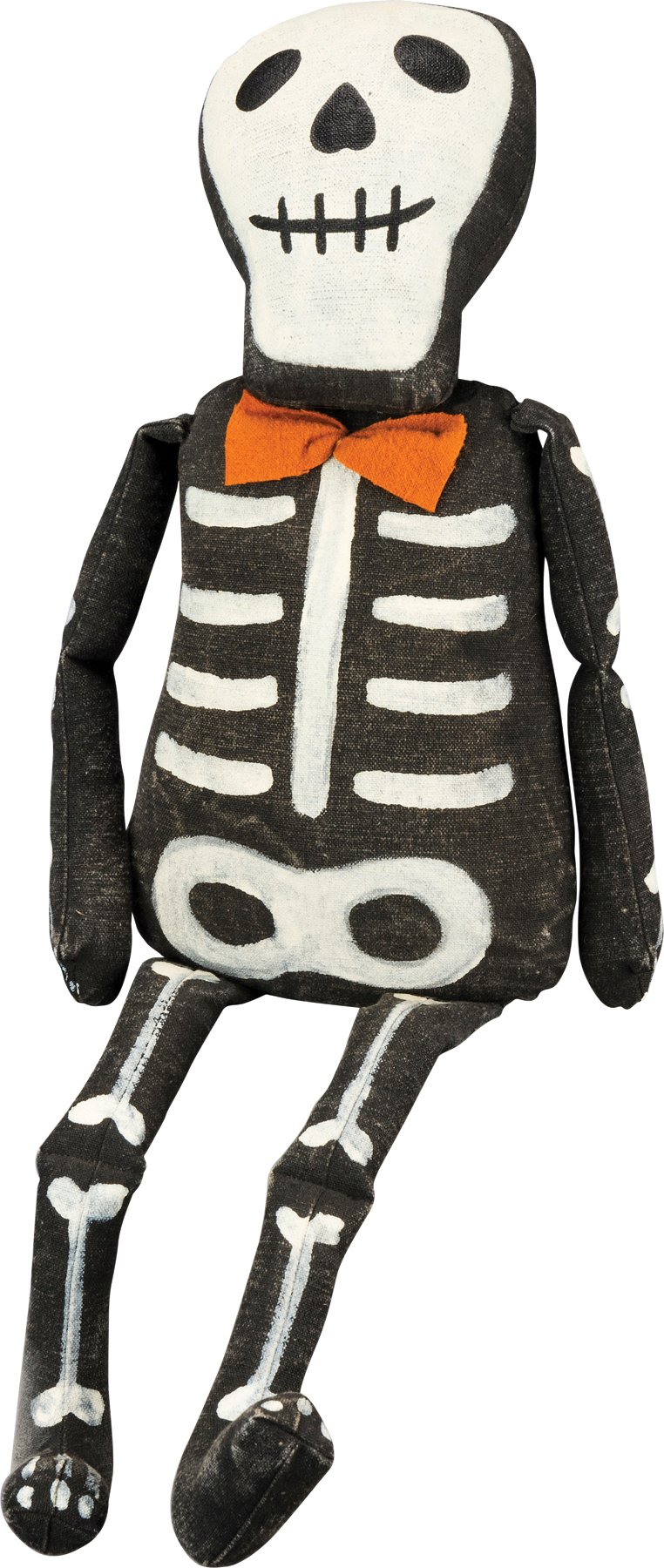 A primitive skeleton doll featuring orange bowtie accent. Complements well with coordinating design pieces or existing decor.