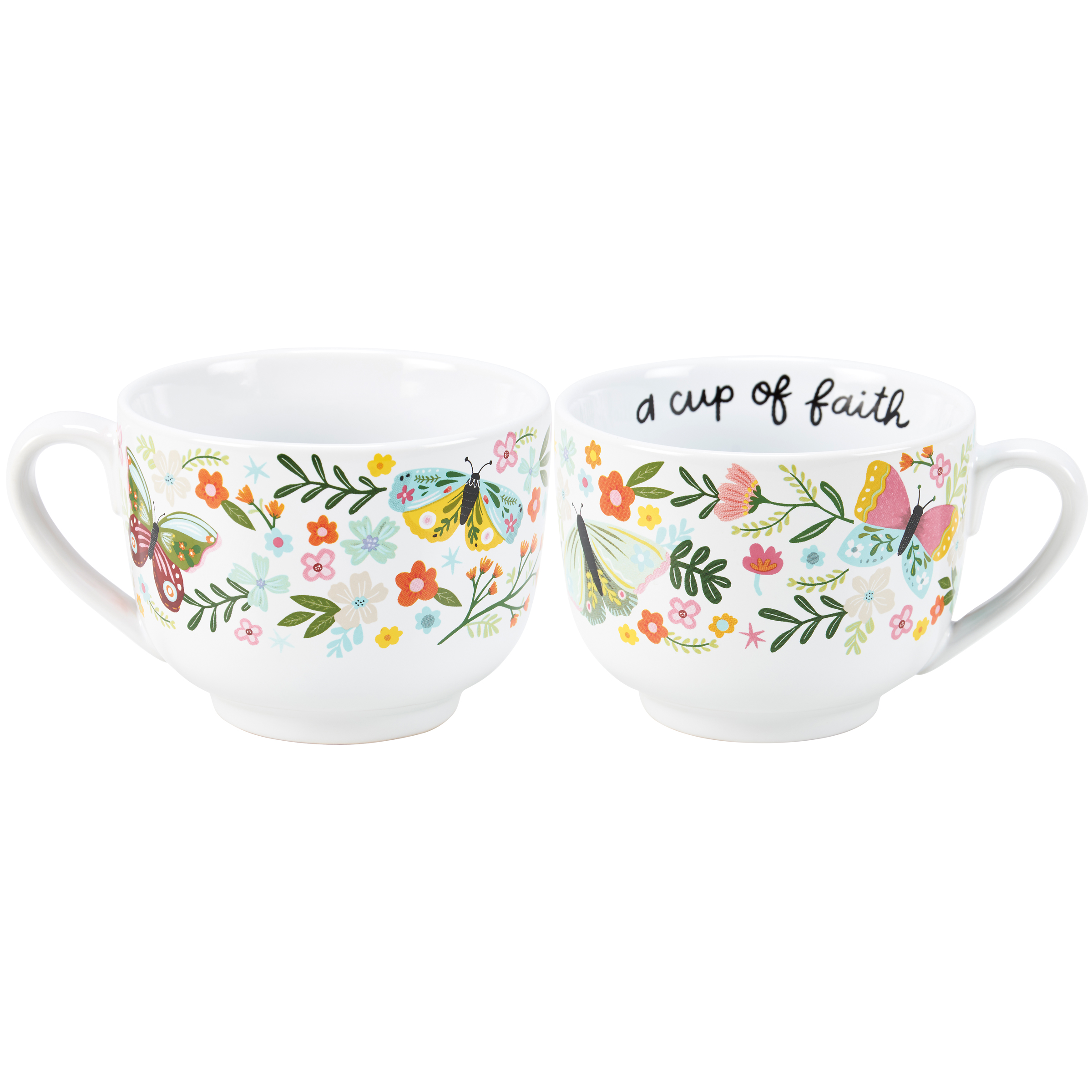 A stoneware 20 oz mug from our Inspiration & Blooms Collection displaying a full wrap-around design of colorful hand illustrated flowers and butterflies. Mug also features an inside design with inspirational sentiment along the rim that reads "A Cup Of Faith" and multi-color flowers at the bottom. Our A Cup Of Faith mug is microwave, oven, dishwasher, and food safe. An inspirational mug perfect for everyday drinkware.