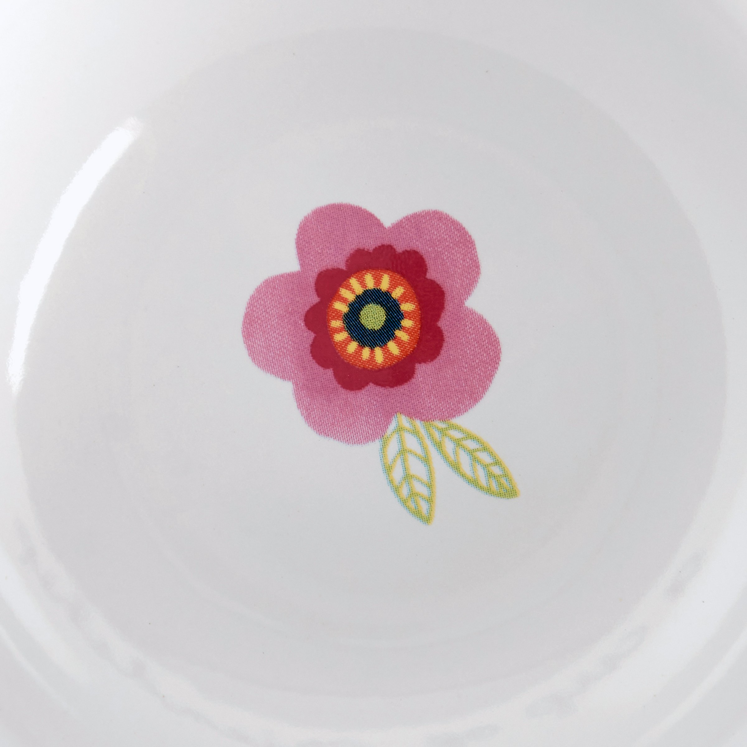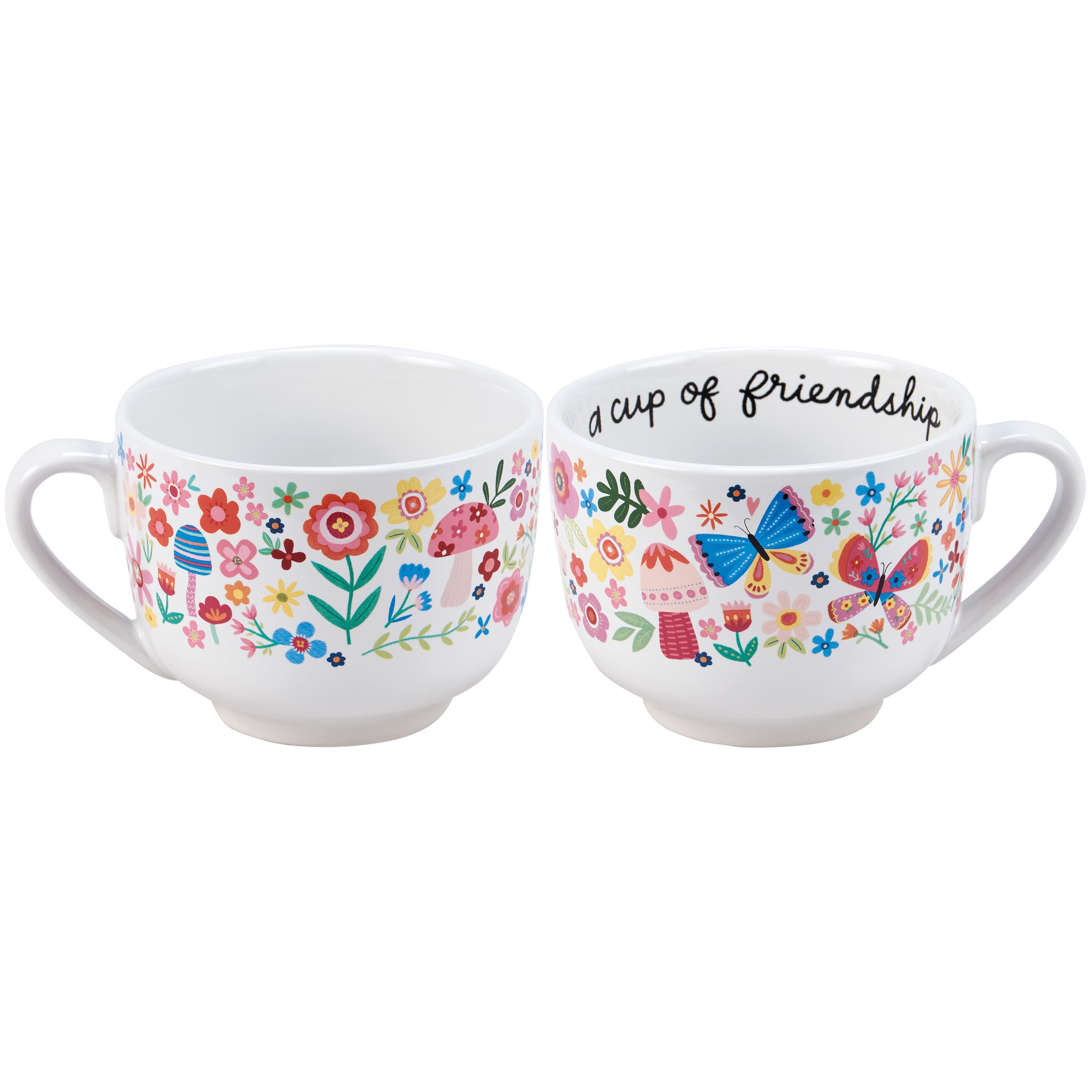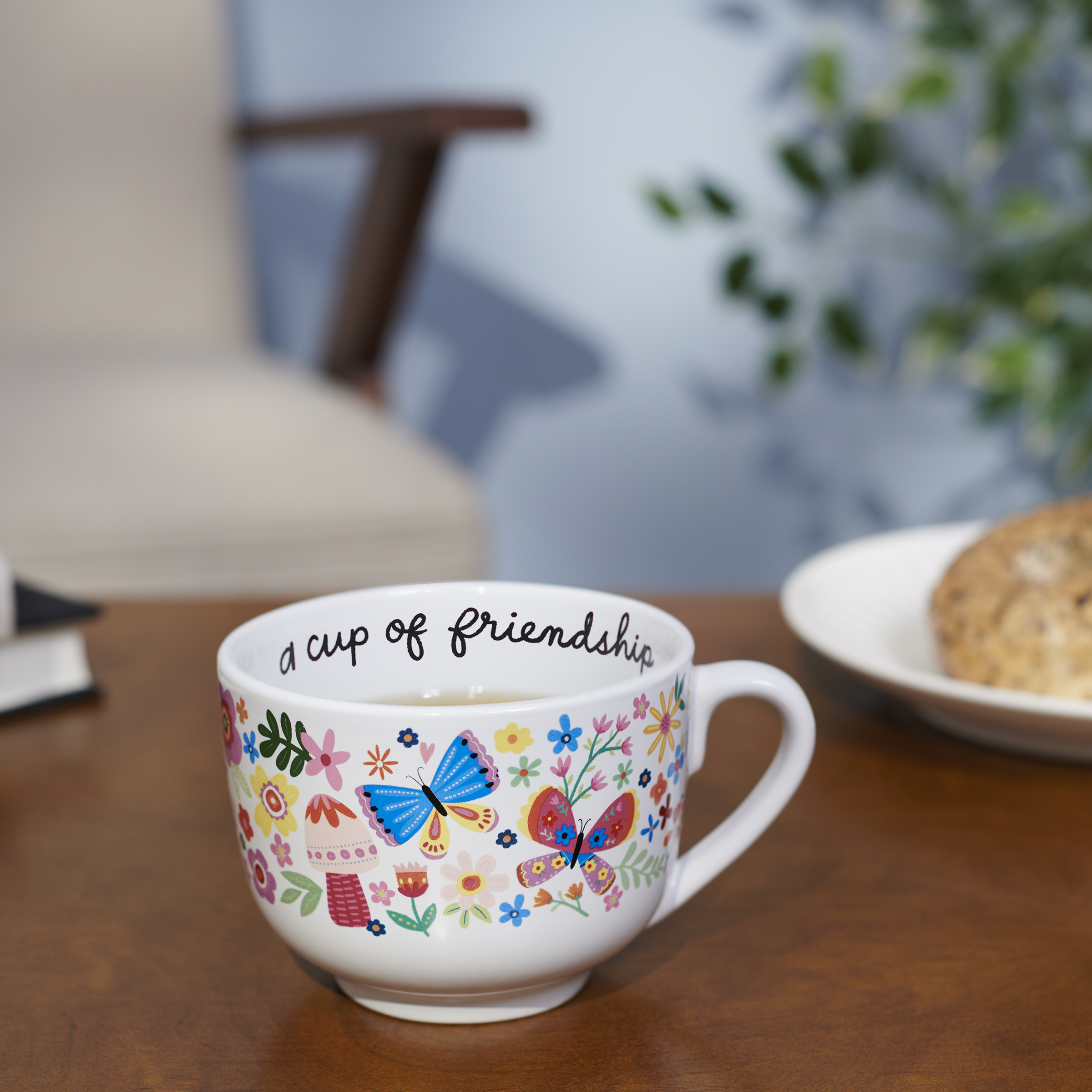 A stoneware 20 oz mug from our Inspiration & Blooms Collection displaying a full wrap-around design of vibrant hand illustrated florals and butterflies. Mug also features an inside design with inspirational sentiment along the rim that reads "A Cup Of Friendship" and pink flower at the bottom. Our A Cup Of Friendship mug is microwave, oven, dishwasher, and food safe for easy use. An inspirational gift perfect for everyday drinkware.