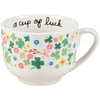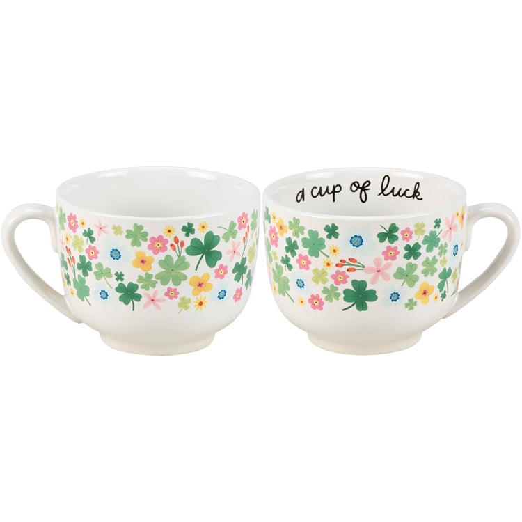 A stoneware 20 oz mug from our Inspiration & Blooms Collection displaying a full wrap-around design of vibrant hand illustrated florals and clovers. Mug also features an inside design with inspirational sentiment along the rim that reads "A Cup Of Luck" and clover at the bottom. Our A Cup Of Luck mug is microwave, oven, dishwasher, and food safe for easy use. An inspirational gift perfect for everyday drinkware.