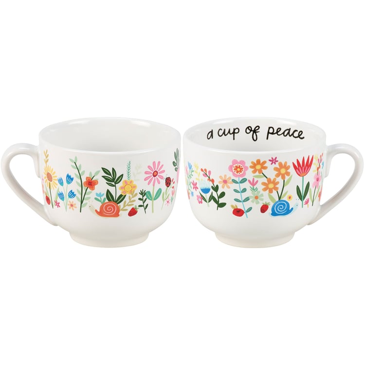 A stoneware 20 oz mug from our Inspiration & Blooms Collection displaying a full wrap-around design of vibrant hand illustrated florals and snails. Mug also features an inside design with inspirational sentiment along the rim that reads "A Cup Of Peace" and snail at the bottom. Our A Cup Of Peace mug is microwave, oven, dishwasher, and food safe for easy use. An inspirational gift perfect for everyday drinkware.