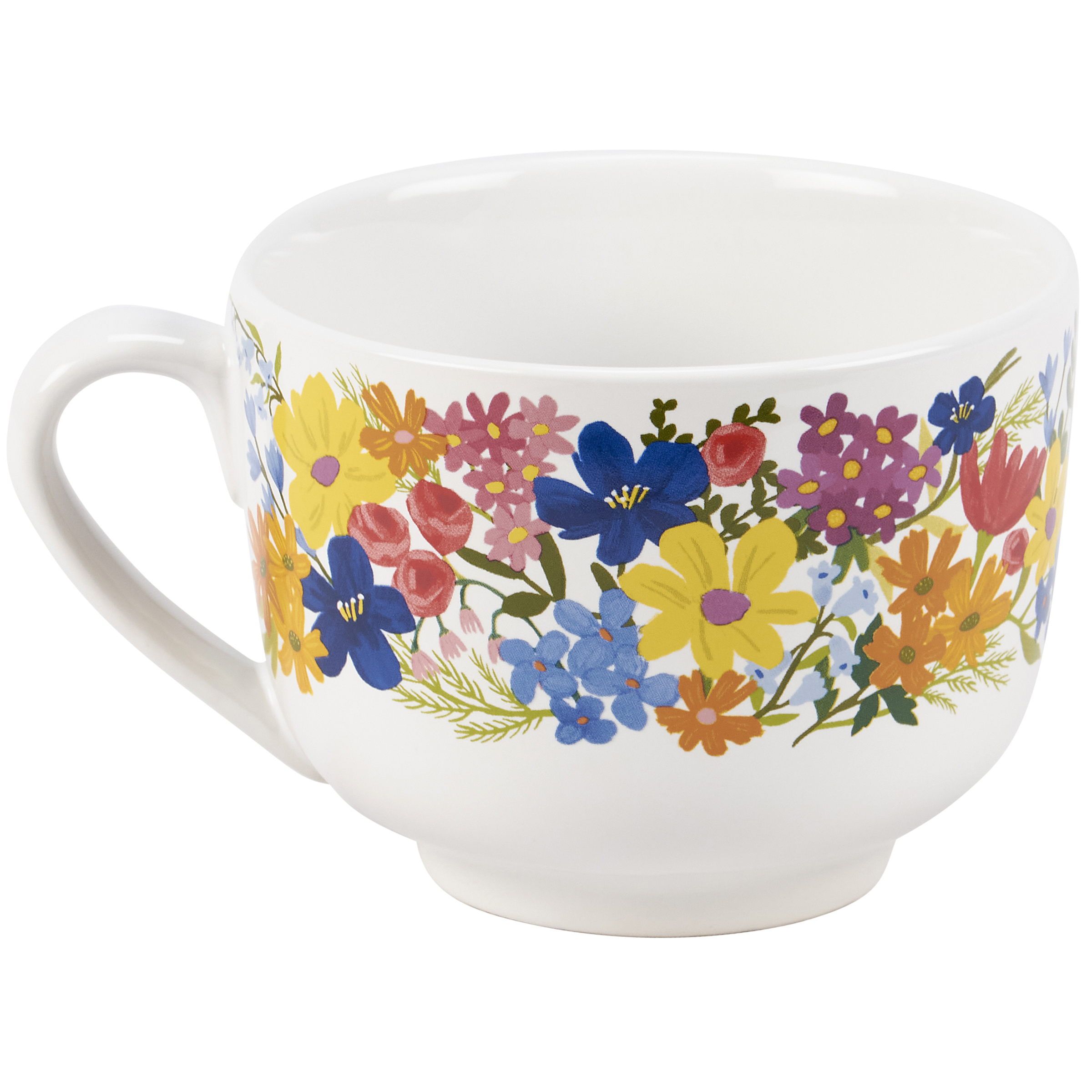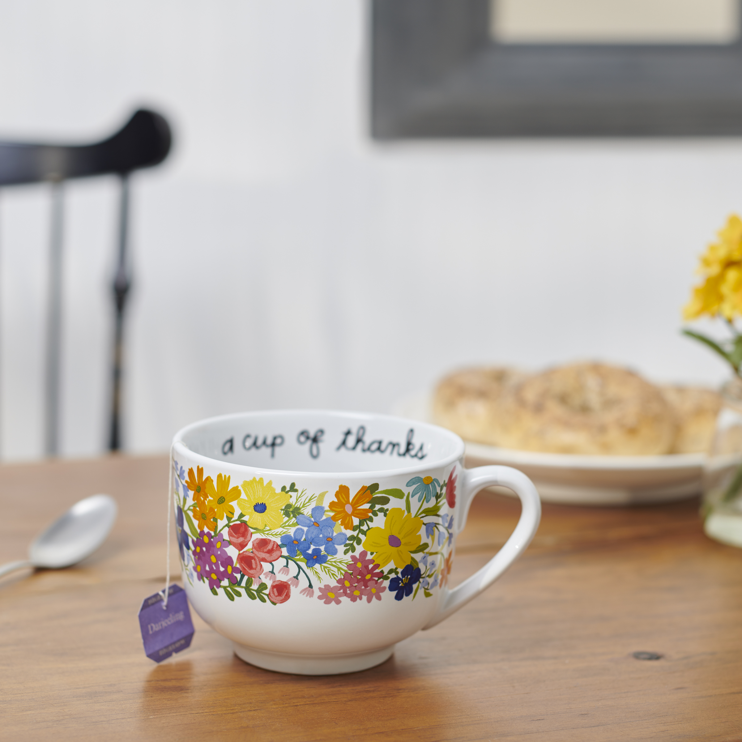 A stoneware 20 oz mug from our Inspiration & Blooms Collection displaying a full wrap-around design of vibrant hand illustrated florals. Mug also features an inside design with inspirational sentiment along the rim that reads "A Cup Of Thanks" and flowers at the bottom. Our A Cup Of Thanks mug is microwave, oven, dishwasher, and food safe for easy use. An inspirational gift perfect for everyday drinkware.