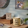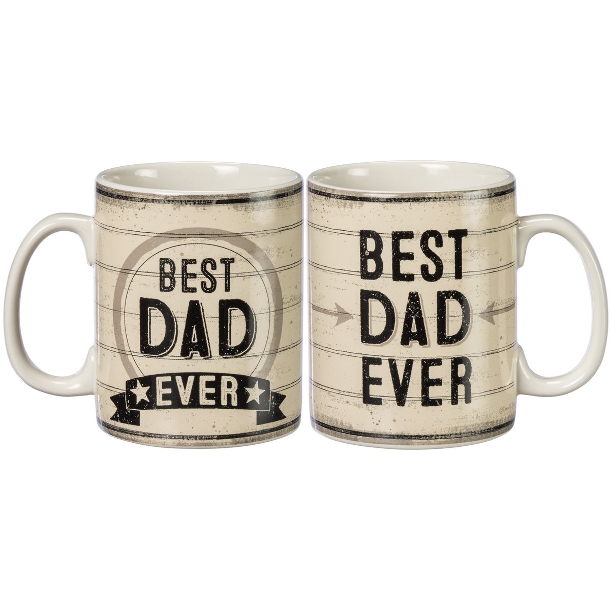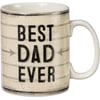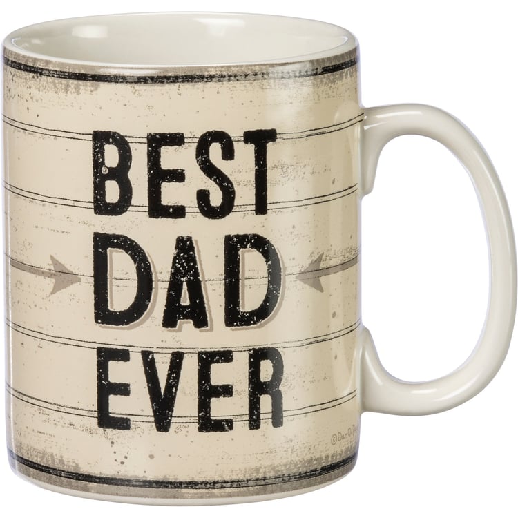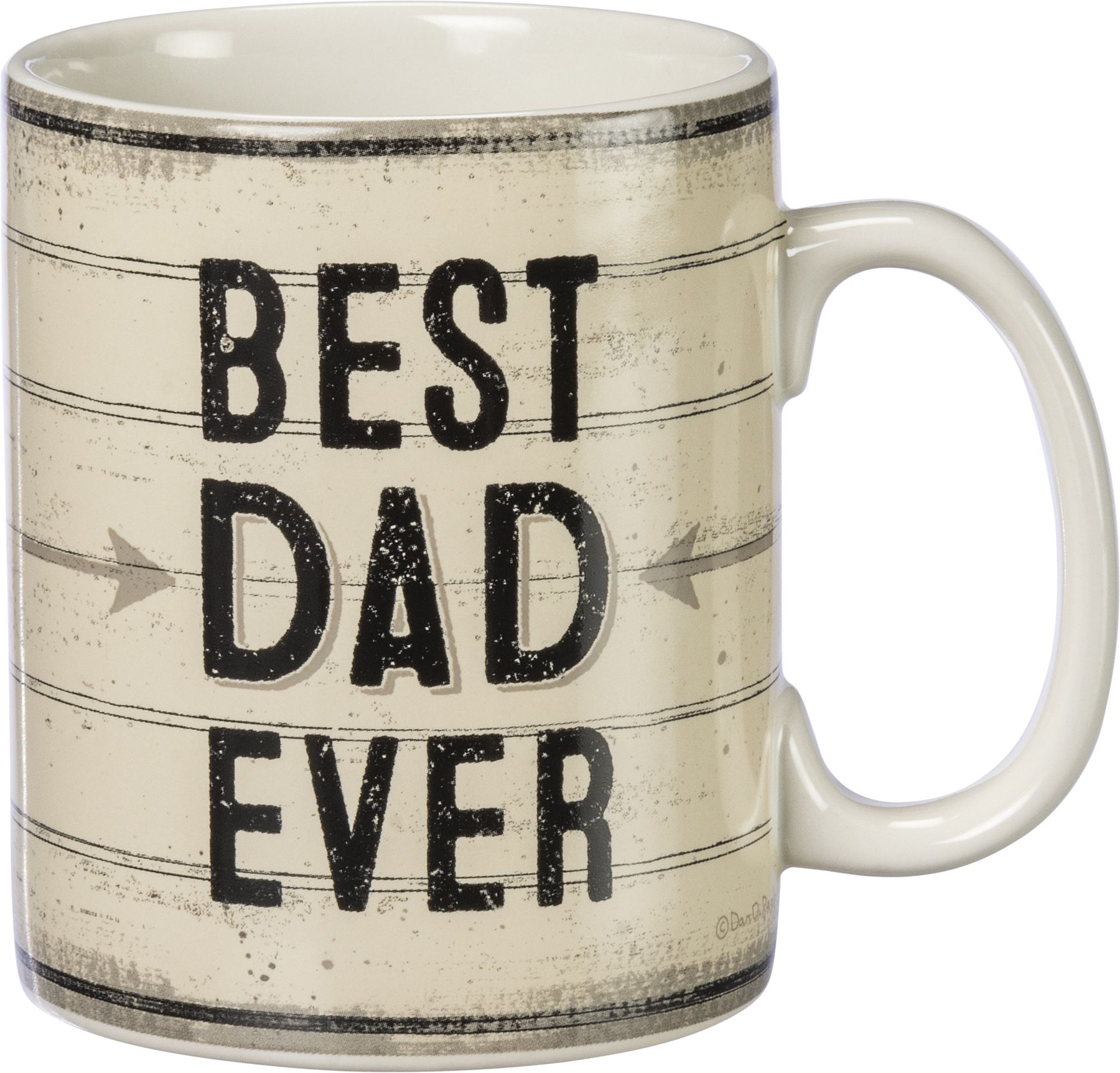 A stoneware coffee mug from our Father's Day Collectionfeaturing a double-sided "Best Dad Ever" sentiment with banner, star, and circle designs. Our Best Dad mug complements well with coordinating design pieces for a cohesive gift set or display. Microwave, oven, dishwasher, and food safe; holds 20 oz.